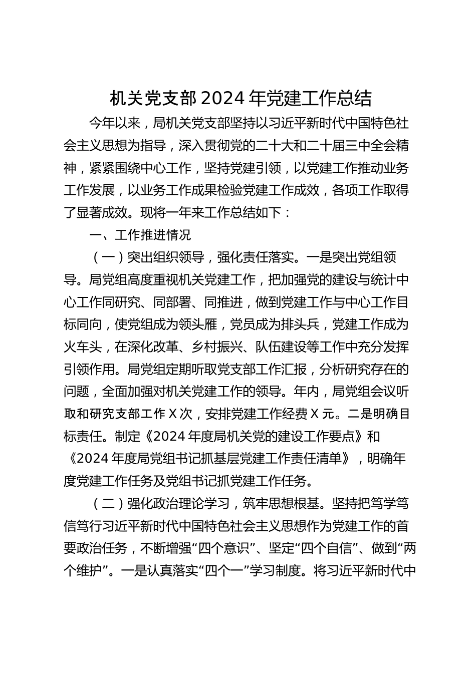 機(jī)關(guān)黨支部2024年黨建工作總結(jié)今年以來,局機(jī)關(guān)黨支部堅(jiān)持以習(xí)近平新時(shí)代中國(guó)特色社會(huì)主義思想為指導(dǎo),深入貫徹黨的二十大和二十屆三中全會(huì)精神,緊緊圍繞中心工作,堅(jiān)持黨建引領(lǐng),以黨建工作推動(dòng)業(yè)務(wù)工作發(fā)展,以業(yè)務(wù)工作成果檢驗(yàn)黨建工作成效,各項(xiàng)工作取得了顯著成效?,F(xiàn)將一年來工作總結(jié)如下:一、工作推進(jìn)情況(一)突出組織領(lǐng)導(dǎo),強(qiáng)化責(zé)任落實(shí)。一是突出黨組領(lǐng)導(dǎo)。局黨組高度重視機(jī)關(guān)黨建工作,把加強(qiáng)黨的建設(shè)與統(tǒng)計(jì)中心工作同研究、同部署、同推進(jìn),做到黨建工作與中心工作目標(biāo)同向,使黨組成為領(lǐng)頭雁,黨員成為排頭兵,黨建工作成為火車頭,在深化改革、鄉(xiāng)村振興...