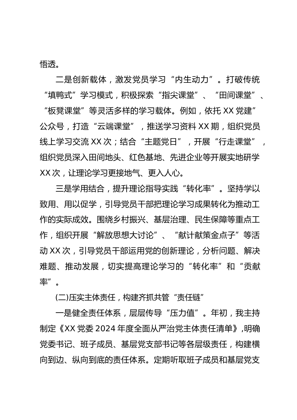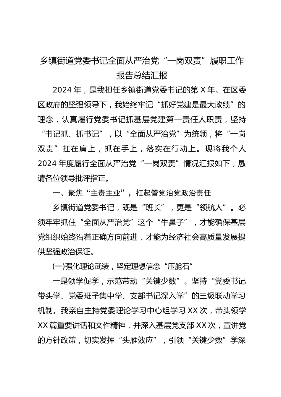 鄉(xiāng)鎮(zhèn)街道黨委書記全面從嚴治黨“一崗雙責”履職工作報告總結匯報2024年,是我擔任鄉(xiāng)鎮(zhèn)街道黨委書記的第X年。在區(qū)委區(qū)政府的堅強領導下,我始終牢記“抓好黨建是最大政績”的理念,認真履行黨委書記抓基層黨建第一責任人職責,堅持“書記抓、抓書記”,以“全面從嚴治黨”為統(tǒng)領,將“一崗雙責”扛在肩上,抓在手上,落實在行動上?,F(xiàn)將我個人2024年度履行全面從嚴治黨“一崗雙責”情況匯報如下,懇請各位領導批評指正。一、聚焦“主責主業(yè)”,扛起管黨治黨政治責任鄉(xiāng)鎮(zhèn)街道黨委書記,既是“班長”,更是“領航人”。必須牢牢抓住“全面從嚴治黨”這個“牛鼻子”,才能確...