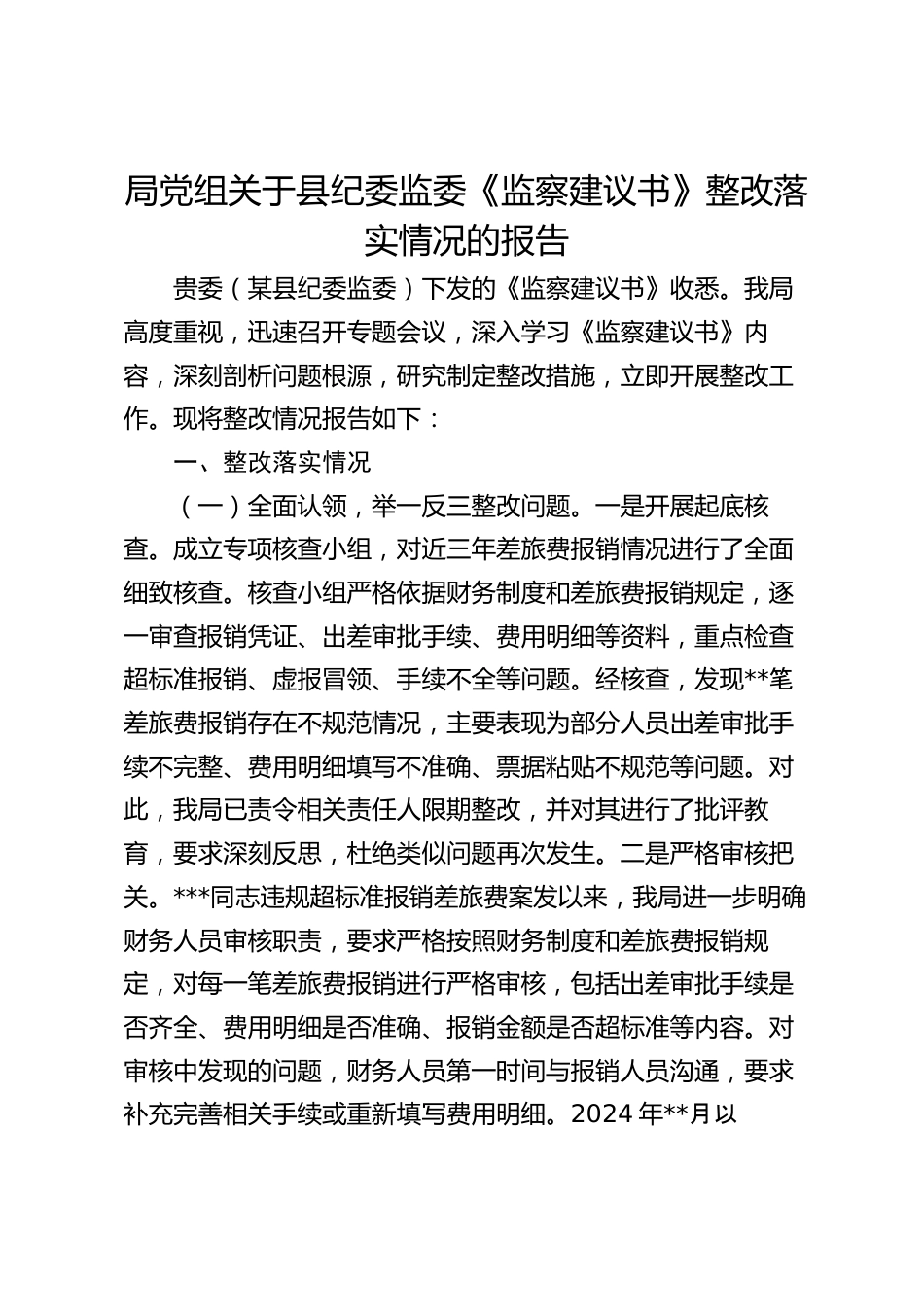 局黨組關(guān)于縣紀(jì)委監(jiān)委《監(jiān)察建議書》整改落實(shí)情況的報(bào)告貴委(某縣紀(jì)委監(jiān)委)下發(fā)的《監(jiān)察建議書》收悉。我局高度重視,迅速召開專題會(huì)議,深入學(xué)習(xí)《監(jiān)察建議書》內(nèi)容,深刻剖析問題根源,研究制定整改措施,立即開展整改工作?,F(xiàn)將整改情況報(bào)告如下:一、整改落實(shí)情況(一)全面認(rèn)領(lǐng),舉一反三整改問題。一是開展起底核查。成立專項(xiàng)核查小組,對(duì)近三年差旅費(fèi)報(bào)銷情況進(jìn)行了全面細(xì)致核查。核查小組嚴(yán)格依據(jù)財(cái)務(wù)制度和差旅費(fèi)報(bào)銷規(guī)定,逐一審查報(bào)銷憑證、出差審批手續(xù)、費(fèi)用明細(xì)等資料,重點(diǎn)檢查超標(biāo)準(zhǔn)報(bào)銷、虛報(bào)冒領(lǐng)、手續(xù)不全等問題。經(jīng)核查,發(fā)現(xiàn)**筆差旅費(fèi)報(bào)銷存在不...