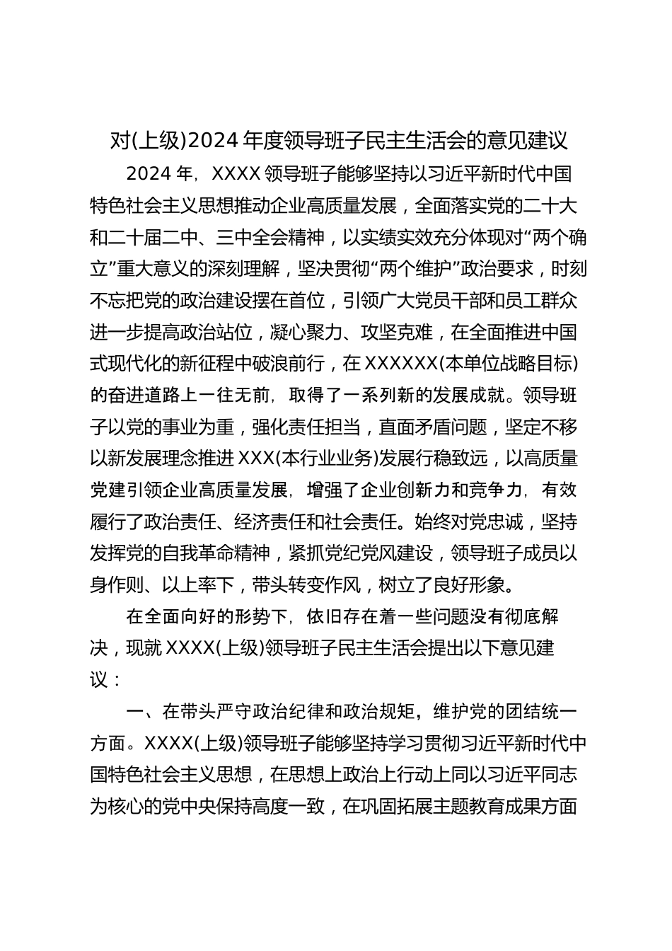 對(duì)(上級(jí))2024年度領(lǐng)導(dǎo)班子民主生活會(huì)的意見建議2024年,XXXX領(lǐng)導(dǎo)班子能夠堅(jiān)持以習(xí)近平新時(shí)代中國特色社會(huì)主義思想推動(dòng)企業(yè)高質(zhì)量發(fā)展,全面落實(shí)黨的二十大“和二十屆二中、三中全會(huì)精神,以實(shí)績實(shí)效充分體現(xiàn)對(duì)兩個(gè)確”“”立重大意義的深刻理解,堅(jiān)決貫徹兩個(gè)維護(hù)政治要求,時(shí)刻不忘把黨的政治建設(shè)擺在首位,引領(lǐng)廣大黨員干部和員工群眾進(jìn)一步提高政治站位,凝心聚力、攻堅(jiān)克難,在全面推進(jìn)中國式現(xiàn)代化的新征程中破浪前行,在XXXXXX(本單位戰(zhàn)略目標(biāo))的道路上一往無前,取得了一系列新的展成就。班奮進(jìn)發(fā)領(lǐng)導(dǎo)子以黨的事業(yè)為重,強(qiáng)化責(zé)任擔(dān)當(dāng),直面矛盾問題,堅(jiān)定不移以新...