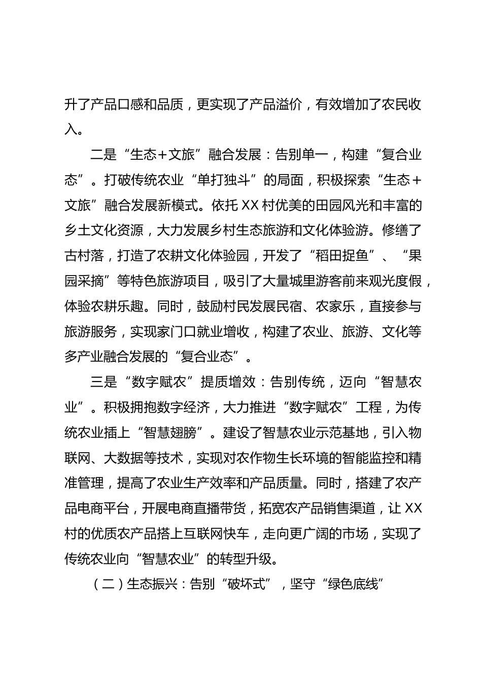 2024年XX村鄉(xiāng)村振興工作總結(jié)2024年,是XX村錨定鄉(xiāng)村振興戰(zhàn)略,砥礪奮進(jìn)的關(guān)鍵一年。我村堅(jiān)持以習(xí)近平新時(shí)代中國(guó)特色社會(huì)主義思想為指引,深入貫徹落實(shí)黨中央、國(guó)務(wù)院關(guān)于鄉(xiāng)村振興的重大決策部署,緊緊圍繞“產(chǎn)業(yè)興旺、生態(tài)宜居、鄉(xiāng)風(fēng)文明、治理有效、生活富?!钡目傄螅⒆阕陨硖厣?,勇于探索創(chuàng)新,攻堅(jiān)克難,在鄉(xiāng)村振興的道路上邁出了堅(jiān)實(shí)步伐,也積累了寶貴的實(shí)踐經(jīng)驗(yàn)?,F(xiàn)將2024年度工作總結(jié)如下:一、工作回顧:多維發(fā)力,繪就鄉(xiāng)村振興新畫卷2024年,XX村緊扣鄉(xiāng)村振興戰(zhàn)略“五大振興”核心內(nèi)涵,堅(jiān)持系統(tǒng)思維、協(xié)同發(fā)力,在多個(gè)領(lǐng)域取得了顯著進(jìn)展,共同構(gòu)成了XX村...