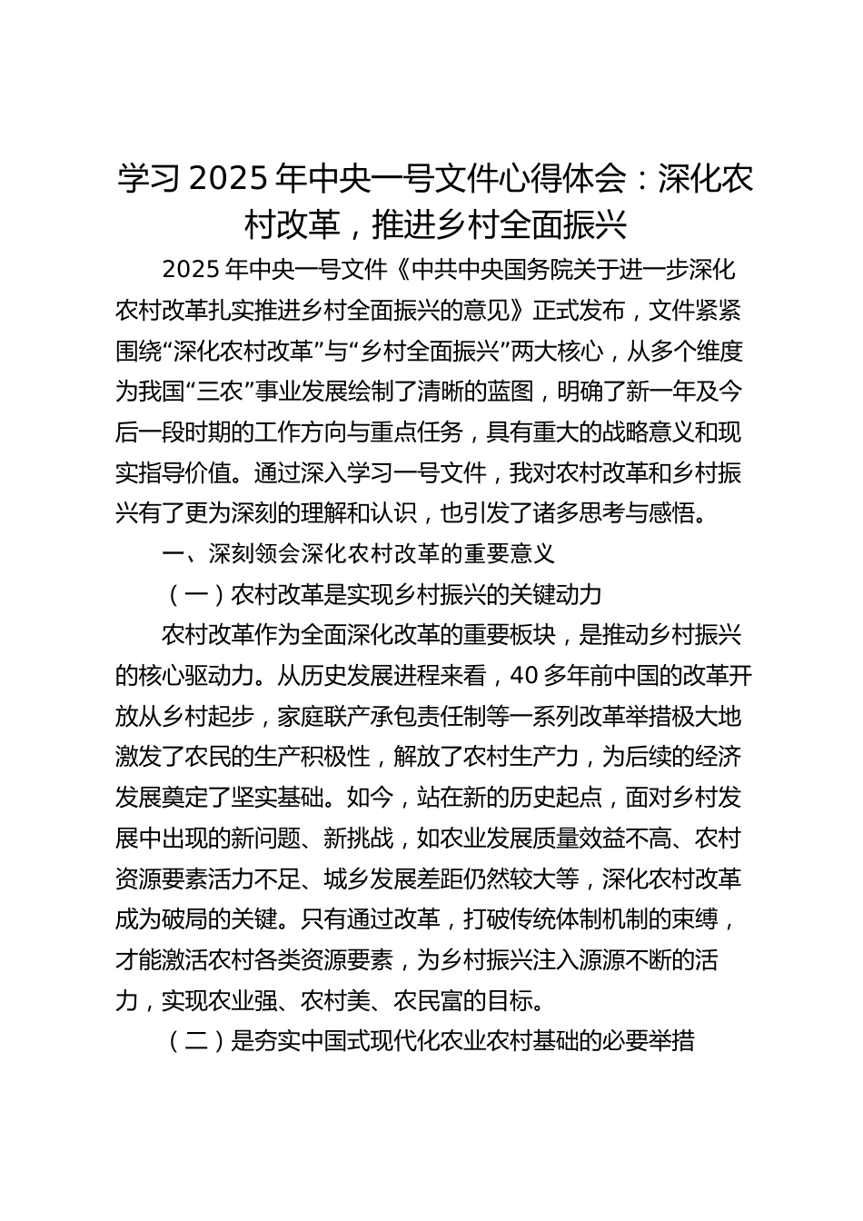 學習2025年中央一號文件心得體會:深化農(nóng)村改革,推進鄉(xiāng)村全面振興2025年中央一號文件《中共中央國務(wù)院關(guān)于進一步深化農(nóng)村改革扎實推進鄉(xiāng)村全面振興的意見》正式發(fā)布,文件緊緊“”“”圍繞深化農(nóng)村改革與鄉(xiāng)村全面振興兩大核心,從多個維度“”為我國三農(nóng)事業(yè)發(fā)展繪制了清晰的藍圖,明確了新一年及今后一段時期的工作方向與重點任務(wù),具有重大的戰(zhàn)略意義和現(xiàn)實指導(dǎo)價值。通過深入學習一號文件,我對農(nóng)村改革和鄉(xiāng)村振興有了更為深刻的理解和認識,也引發(fā)了諸多思考與感悟。一、深刻領(lǐng)會深化農(nóng)村改革的重要意義(一)農(nóng)村改革是實現(xiàn)鄉(xiāng)村振興的關(guān)鍵動力農(nóng)村改革作為全面深化...