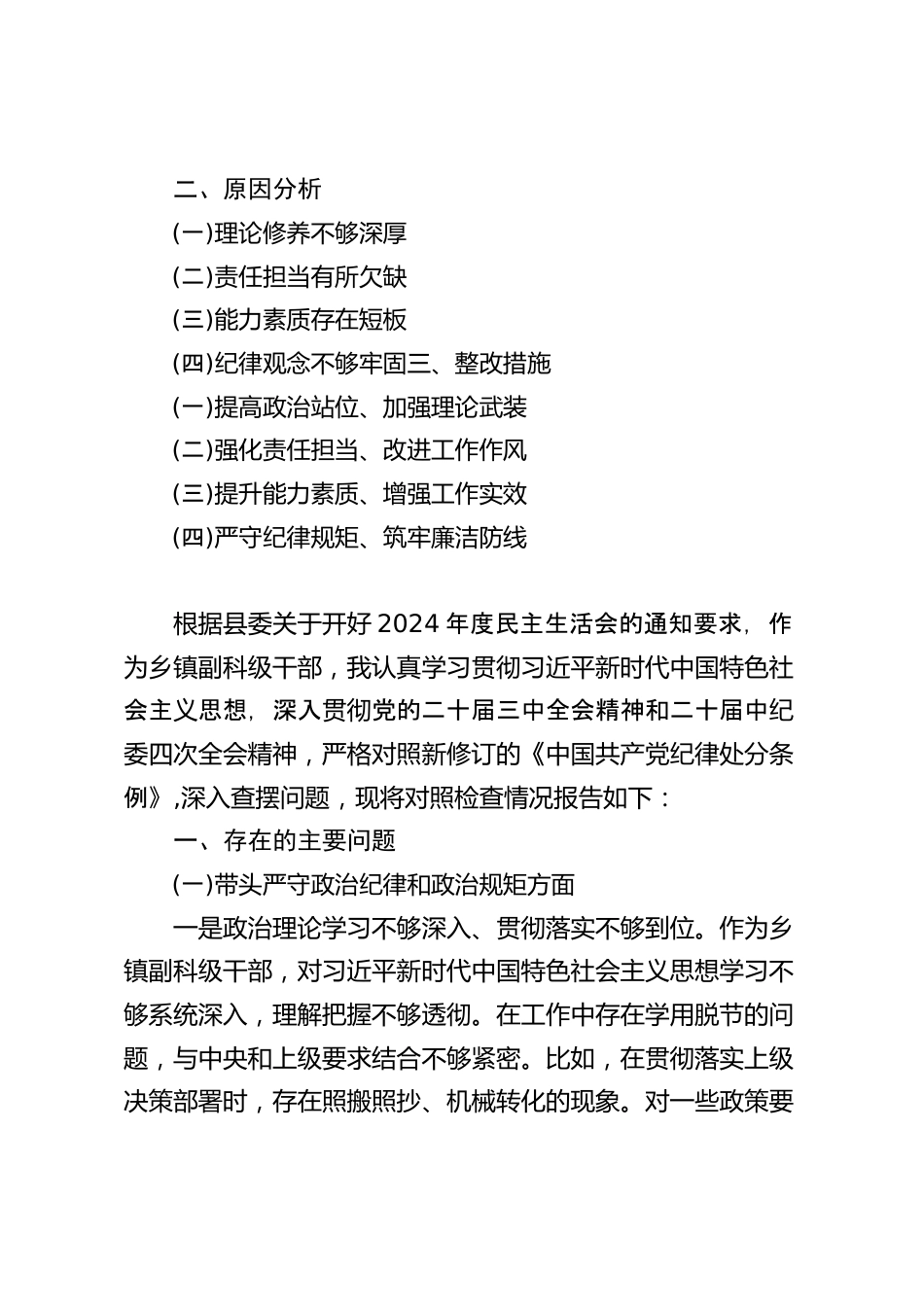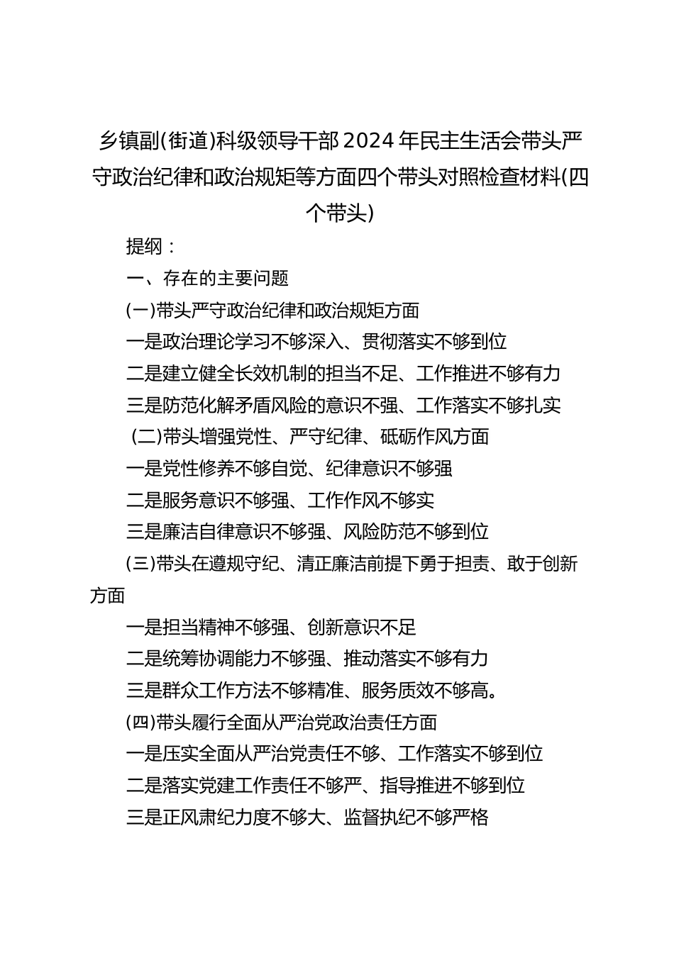 鄉(xiāng)鎮(zhèn)(街道)副科級領(lǐng)導(dǎo)干部2024年度民主生活會帶頭嚴(yán)守政治紀(jì)律和政治規(guī)矩等方面四個帶頭對照檢查材料(四個帶頭)VIP免費