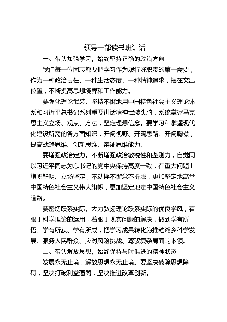 領(lǐng)導(dǎo)干部讀書班講話一、帶頭加強(qiáng)學(xué)習(xí),始終堅(jiān)持正確的政治方向我們每一位同志都要把學(xué)習(xí)作為履行好職責(zé)的第一需要,作為一種政治責(zé)任、一種生活態(tài)度、一種精神追求,擺在突出位置,不斷提高思想境界和工作能力。要強(qiáng)化理論武裝。堅(jiān)持不懈地用中國特色社會(huì)主義理論體系和習(xí)近平總書記系列重要講話精神武裝頭腦,系統(tǒng)掌握馬克思主義立場(chǎng)、觀點(diǎn)、方法,堅(jiān)定理想信念。要學(xué)習(xí)和掌握現(xiàn)代化建設(shè)所需的各方面知識(shí),開闊視野、開闊思路、開闊胸襟,提高戰(zhàn)略思維、創(chuàng)新思維、辯證思維能力。要增強(qiáng)政治定力。不斷增強(qiáng)政治敏銳性和鑒別力,自覺同以習(xí)近平同志為總書記的黨中央保持高...