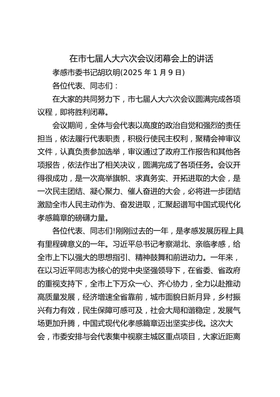 在市七屆人大六次會議閉幕會上的講話孝感市委書記胡玖明(2025年1月9日)各位代表、同志們:在大家的共同努力下,市七屆人大六次會議圓滿完成各項議程,即將勝利閉幕。會議期間,全體與會代表以高度的政治自覺和強烈的責任擔當,依法履行代表職責,積極行使民主權利,聚精會神審議文件,認真負責參加選舉,審議通過了政府工作報告和其他各項報告,依法作出了相關決議,圓滿完成了各項任務。會議開得很成功,是一次高舉旗幟、求真務實、開拓進取的大會,是一次民主團結、凝心聚力、催人奮進的大會,必將進一步團結激勵全市人民主動作為、奮發(fā)進取,匯聚起譜寫中國式現(xiàn)代化孝...