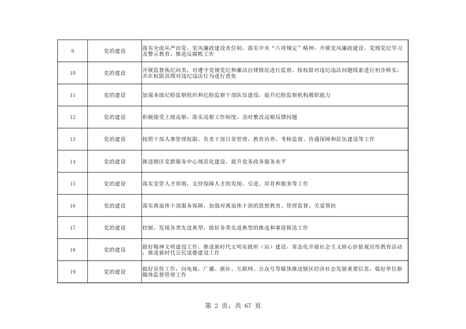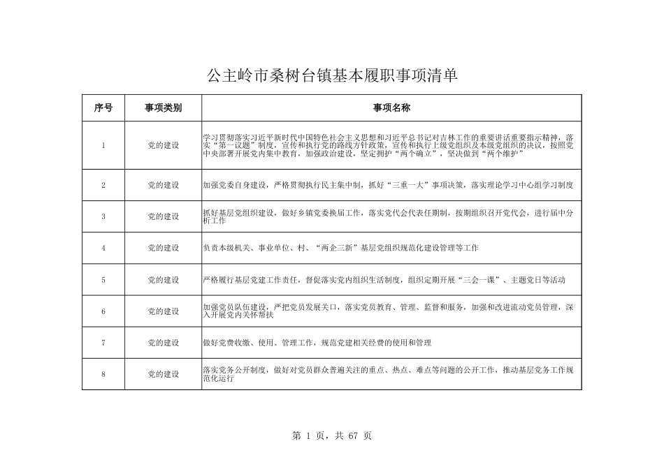 第1頁,共67頁公主嶺市桑樹臺鎮(zhèn)基本履職事項清單序號事項類別事項名稱1黨的建設2黨的建設加強黨委自身建設,嚴格貫徹執(zhí)行民主集中制,抓好“三重一大”事項決策,落實理論學習中心組學習制度3黨的建設4黨的建設負責本級機關、事業(yè)單位、村、“兩企三新”基層黨組織規(guī)范化建設管理等工作5黨的建設嚴格履行基層黨建工作責任,督促落實黨內(nèi)組織生活制度,組織定期開展“三會一課”、主題黨日等活動6黨的建設7黨的建設做好黨費收繳、使用、管理工作,規(guī)范黨建相關經(jīng)費的使用和管理8黨的建設學習貫徹落實習近平新時代中國特色社會主義思想和習近平總書記對吉林工作的重要講話...