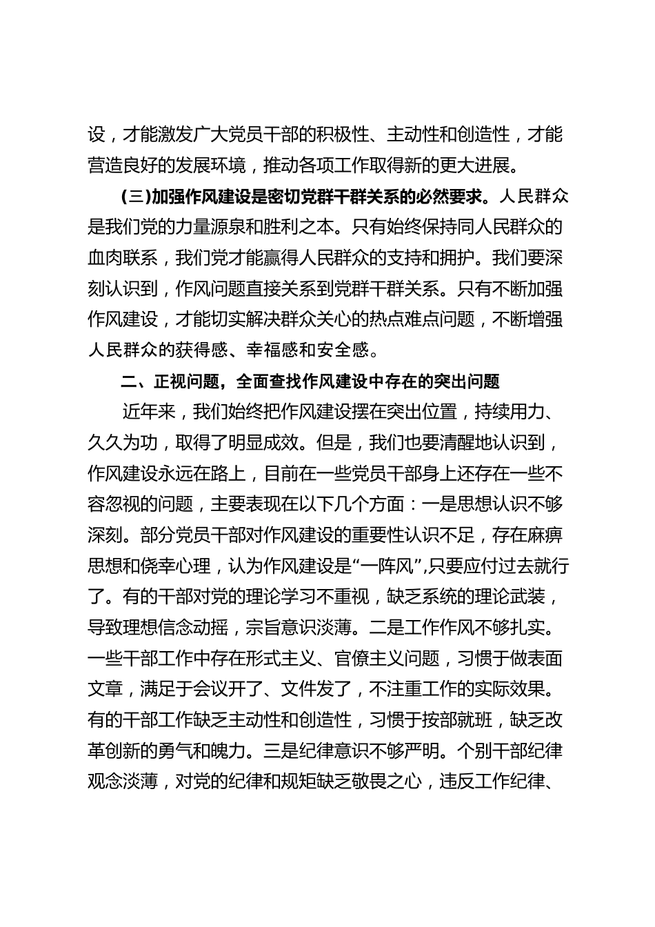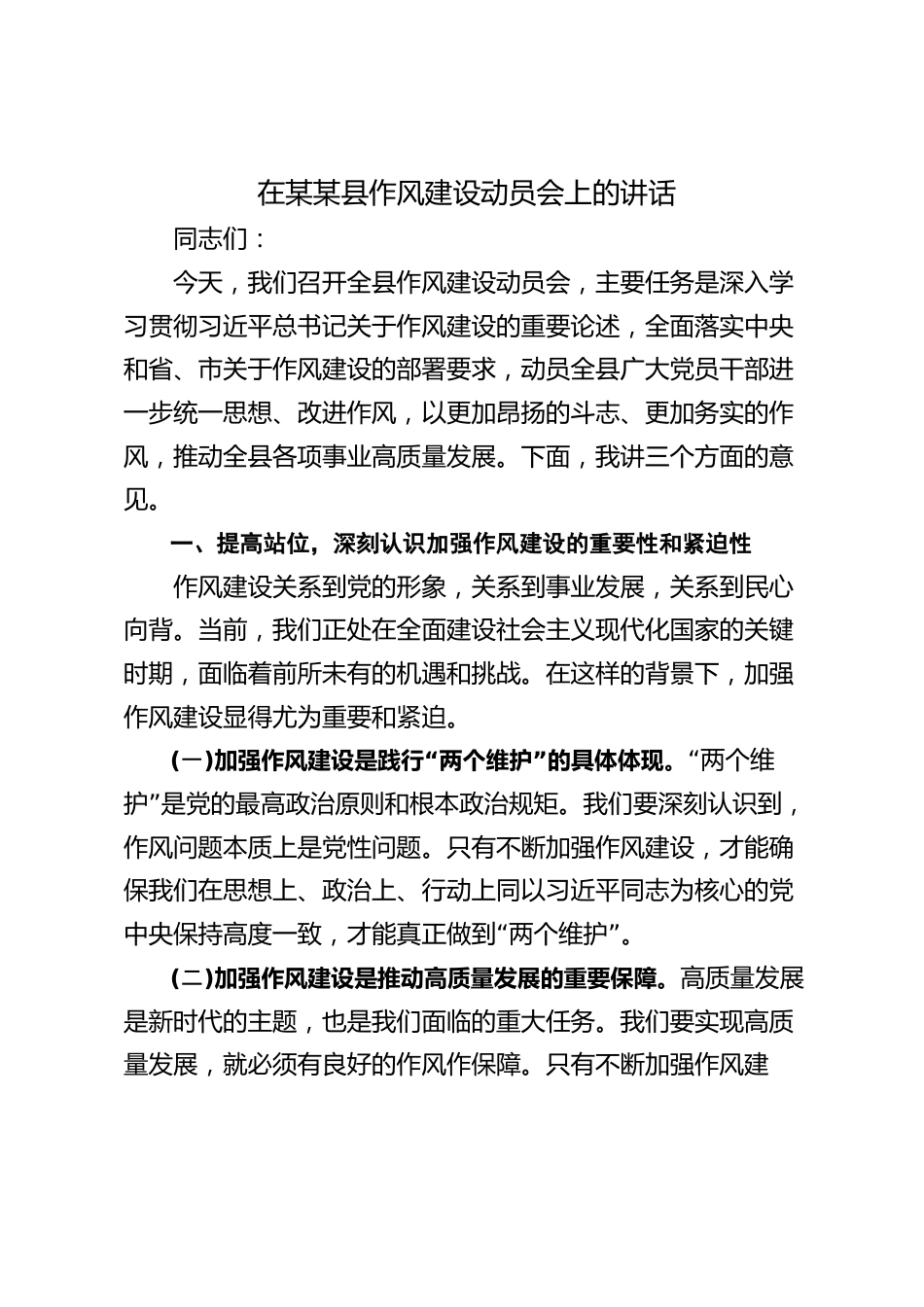 在某某縣作風(fēng)建設(shè)動(dòng)員會(huì)上的講話同志們:今天,我們召開全縣作風(fēng)建設(shè)動(dòng)員會(huì),主要任務(wù)是深入學(xué)習(xí)貫徹習(xí)近平總書記關(guān)于作風(fēng)建設(shè)的重要論述,全面落實(shí)中央和省、市關(guān)于作風(fēng)建設(shè)的部署要求,動(dòng)員全縣廣大黨員干部進(jìn)一步統(tǒng)一思想、改進(jìn)作風(fēng),以更加昂揚(yáng)的斗志、更加務(wù)實(shí)的作風(fēng),推動(dòng)全縣各項(xiàng)事業(yè)高質(zhì)量發(fā)展。下面,我講三個(gè)方面的意見。一、提高站位,深刻認(rèn)識(shí)加強(qiáng)作風(fēng)建設(shè)的重要性和緊迫性作風(fēng)建設(shè)關(guān)系到黨的形象,關(guān)系到事業(yè)發(fā)展,關(guān)系到民心向背。當(dāng)前,我們正處在全面建設(shè)社會(huì)主義現(xiàn)代化國家的關(guān)鍵時(shí)期,面臨著前所未有的機(jī)遇和挑戰(zhàn)。在這樣的背景下,加強(qiáng)作風(fēng)建設(shè)顯得尤...