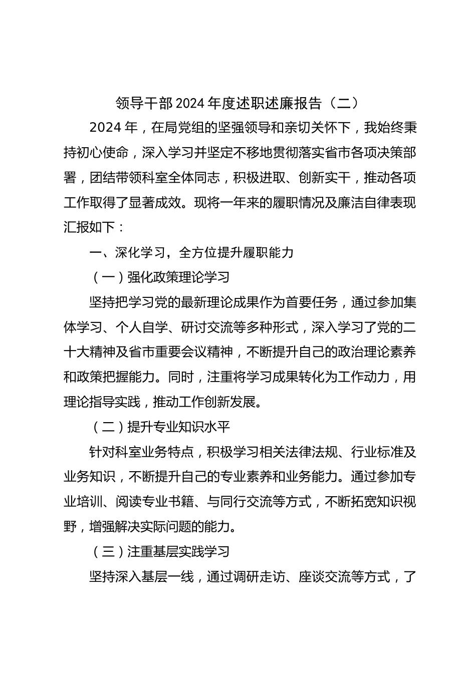 領(lǐng)導(dǎo)干部2024年度述職述廉報(bào)告(二)2024年,在局黨組的堅(jiān)強(qiáng)領(lǐng)導(dǎo)和親切關(guān)懷下,我始終秉持初心使命,深入學(xué)習(xí)并堅(jiān)定不移地貫徹落實(shí)省市各項(xiàng)決策部署,團(tuán)結(jié)帶領(lǐng)科室全體同志,積極進(jìn)取、創(chuàng)新實(shí)干,推動(dòng)各項(xiàng)工作取得了顯著成效。現(xiàn)將一年來(lái)的履職情況及廉潔自律表現(xiàn)匯報(bào)如下:一、深化學(xué)習(xí),全方位提升履職能力(一)強(qiáng)化政策理論學(xué)習(xí)堅(jiān)持把學(xué)習(xí)黨的最新理論成果作為首要任務(wù),通過(guò)參加集體學(xué)習(xí)、個(gè)人自學(xué)、研討交流等多種形式,深入學(xué)習(xí)了黨的二十大精神及省市重要會(huì)議精神,不斷提升自己的政治理論素養(yǎng)和政策把握能力。同時(shí),注重將學(xué)習(xí)成果轉(zhuǎn)化為工作動(dòng)力,用理論指導(dǎo)實(shí)...