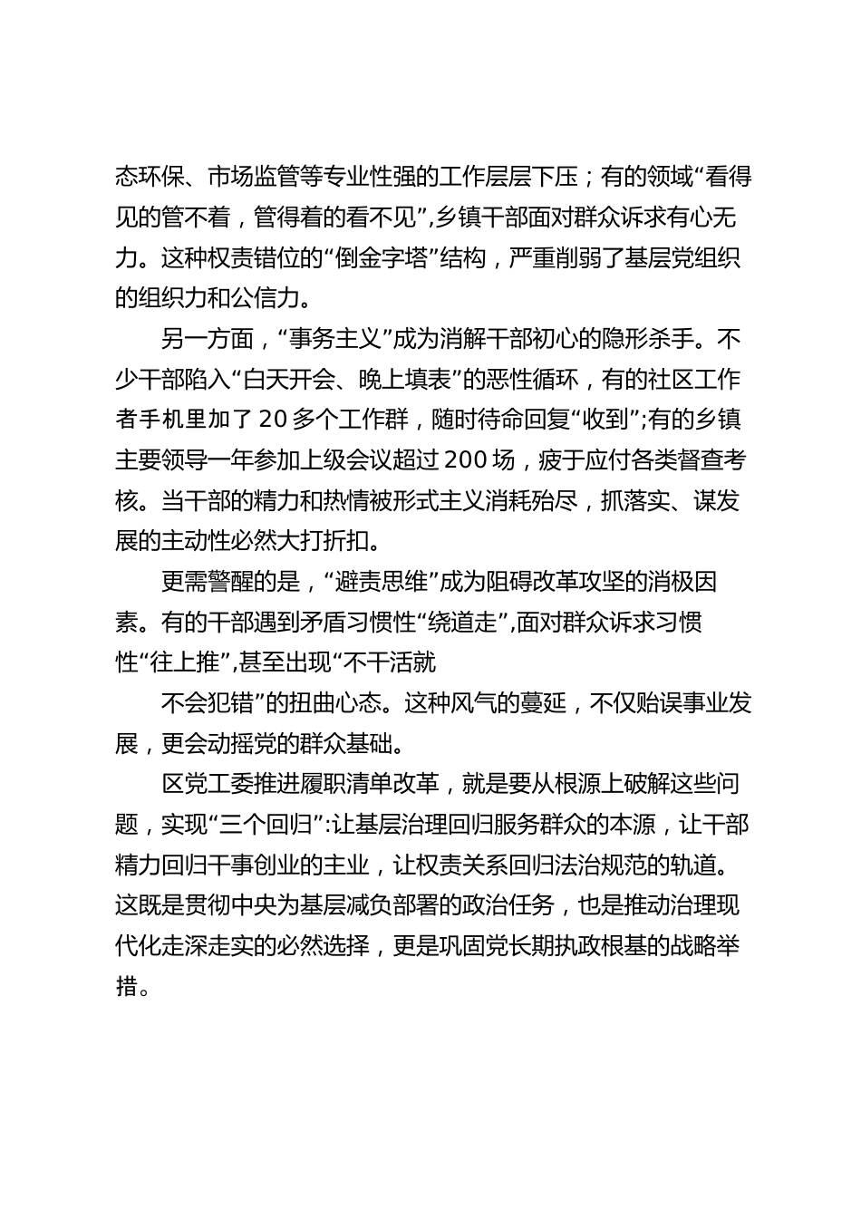 高新區(qū)黨工委書(shū)記在鄉(xiāng)鎮(zhèn)(街道)履職事項(xiàng)清單工作動(dòng)員會(huì)上的講話同志們:今天,我們召開(kāi)鄉(xiāng)鎮(zhèn)(街道)履職事項(xiàng)清單工作動(dòng)員會(huì),主“要任務(wù)是深入貫徹落實(shí)黨中央關(guān)于為基層減負(fù)、賦能、增”效的決策部署和省市關(guān)于基層治理現(xiàn)代化的工作要求,全面部署鄉(xiāng)鎮(zhèn)(街道)履職事項(xiàng)清單編制和實(shí)施工作。這是高新區(qū)首次以鄉(xiāng)鎮(zhèn)(街道)為主體系統(tǒng)推進(jìn)權(quán)責(zé)清單化管理,既是對(duì)基層治理的一次全面體檢,也是對(duì)干部作風(fēng)能力的一次實(shí)戰(zhàn)檢驗(yàn)。參會(huì)的有各鄉(xiāng)鎮(zhèn)(街道)黨政主要負(fù)責(zé)同志、分管同志,以及區(qū)直有關(guān)部門負(fù)責(zé)人。大家身處服務(wù)群眾、落實(shí)政策、維護(hù)“”穩(wěn)定的最后一公里,“”是基層治理的神經(jīng)...