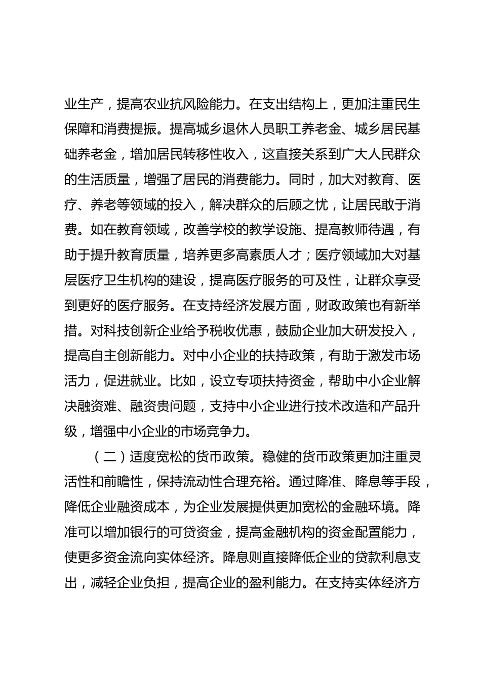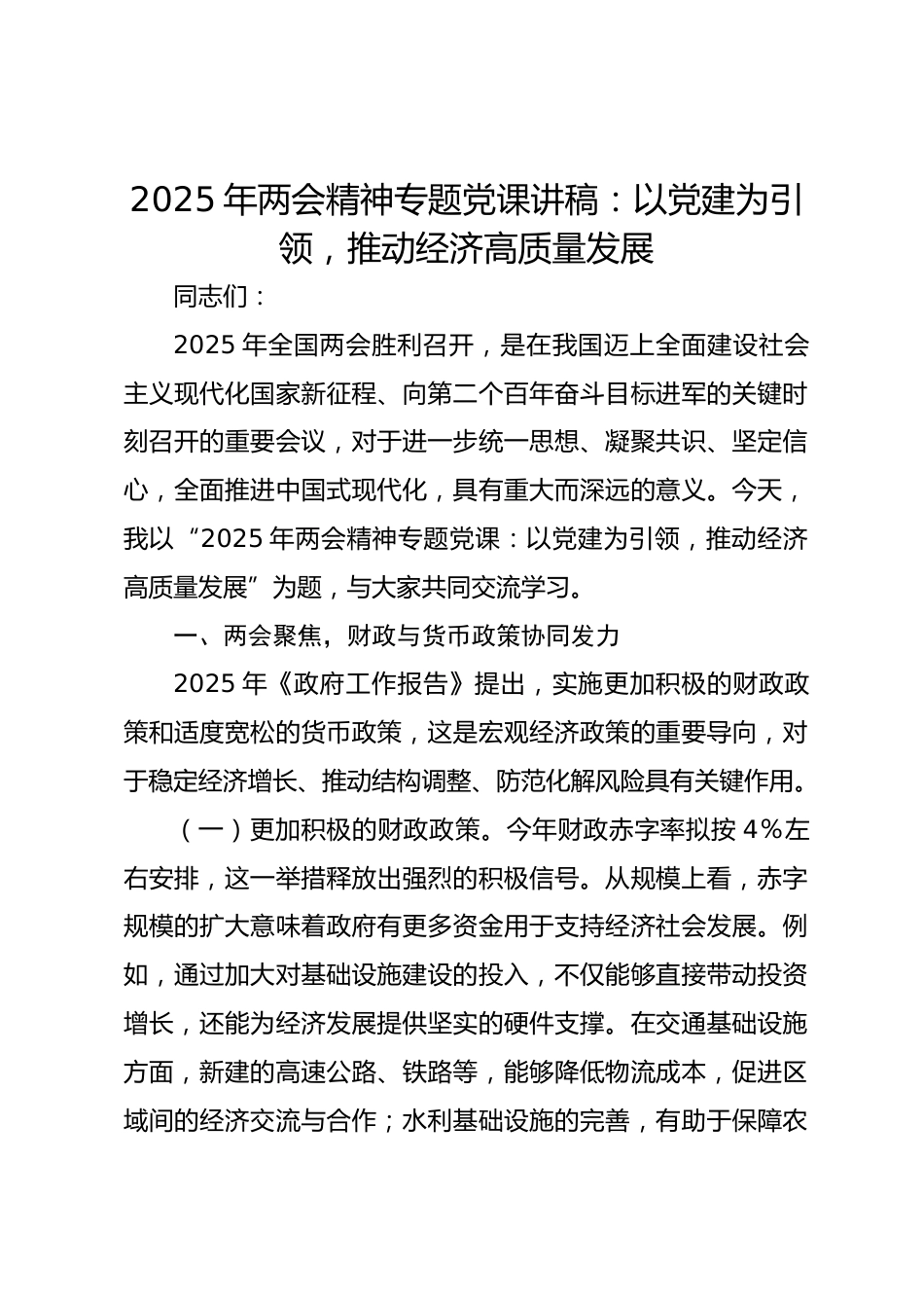 2025年兩會精神專題黨課講稿:以黨建為引領,推動經濟高質量發(fā)展同志們:2025年全國兩會勝利召開,是在我國邁上全面建設社會主義現代化國家新征程、向第二個百年奮斗目標進軍的關鍵時刻召開的重要會議,對于進一步統(tǒng)一思想、凝聚共識、堅定信心,全面推進中國式現代化,具有重大而深遠的意義。今天,我以“2025年兩會精神專題黨課:以黨建為引領,推動經濟高質量發(fā)展”為題,與大家共同交流學習。一、兩會聚焦,財政與貨幣政策協(xié)同發(fā)力2025年《政府工作報告》提出,實施更加積極的財政政策和適度寬松的貨幣政策,這是宏觀經濟政策的重要導向,對于穩(wěn)定經濟增長、推動結構...