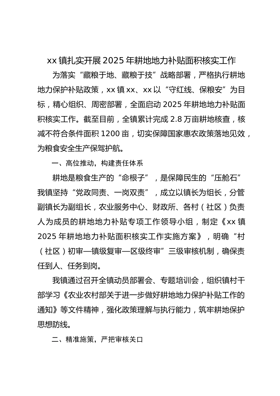 xx鎮(zhèn)扎實(shí)開(kāi)展2025年耕地地力補(bǔ)貼面積核實(shí)工作為落實(shí)“藏糧于地、藏糧于技”戰(zhàn)略部署,嚴(yán)格執(zhí)行耕地地力保護(hù)補(bǔ)貼政策,xx鎮(zhèn)xx、xx以“守紅線、保糧安”為目標(biāo),精心組織、周密部署,全面啟動(dòng)2025年耕地地力補(bǔ)貼面積核實(shí)工作。截至目前,全鎮(zhèn)累計(jì)完成2.8萬(wàn)畝耕地核查,核減不符合條件面積1200畝,切實(shí)保障國(guó)家惠農(nóng)政策落地見(jiàn)效,為糧食安全生產(chǎn)保駕護(hù)航。一、高位推動(dòng),構(gòu)建責(zé)任體系耕地是糧食生產(chǎn)的“命根子”,是保障民生的“壓艙石”我鎮(zhèn)堅(jiān)持“黨政同責(zé)、一崗雙責(zé)”,成立以鎮(zhèn)長(zhǎng)為組長(zhǎng),分管副鎮(zhèn)長(zhǎng)為副組長(zhǎng),農(nóng)業(yè)服務(wù)中心、財(cái)政所、各村(社區(qū))負(fù)責(zé)人為成員的耕地地力...