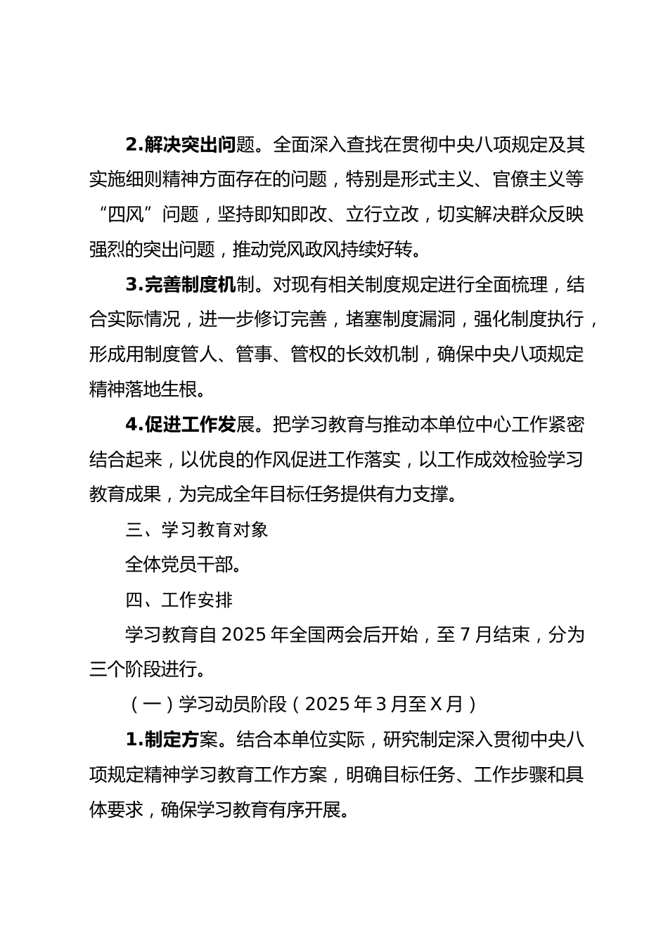 (6篇)深入貫徹中央八項規(guī)定精神學(xué)習(xí)教育工作方案(詳細版)深入貫徹中央八項規(guī)定精神學(xué)習(xí)教育工作方案為深入貫徹落實黨中央關(guān)于全面從嚴治黨的戰(zhàn)略部署,鞏固深化主題教育和黨紀學(xué)習(xí)教育成果,根據(jù)中共中央辦公廳印發(fā)的《關(guān)于在全黨開展深入貫徹中央八項規(guī)定精神學(xué)習(xí)教育的通知》要求,結(jié)合本單位實際,制定本工作方案。一、指導(dǎo)思想以習(xí)近平新時代中國特色社會主義思想為指導(dǎo),全面貫徹黨的二十大和二十屆二中、三中全會精神,深刻領(lǐng)悟“兩個確立”的決定性意義,增強“四個意識”、堅定“四個自信”、做到“兩個維護”,緊緊圍繞深入貫徹中央八項規(guī)定及其實施細則精神...
