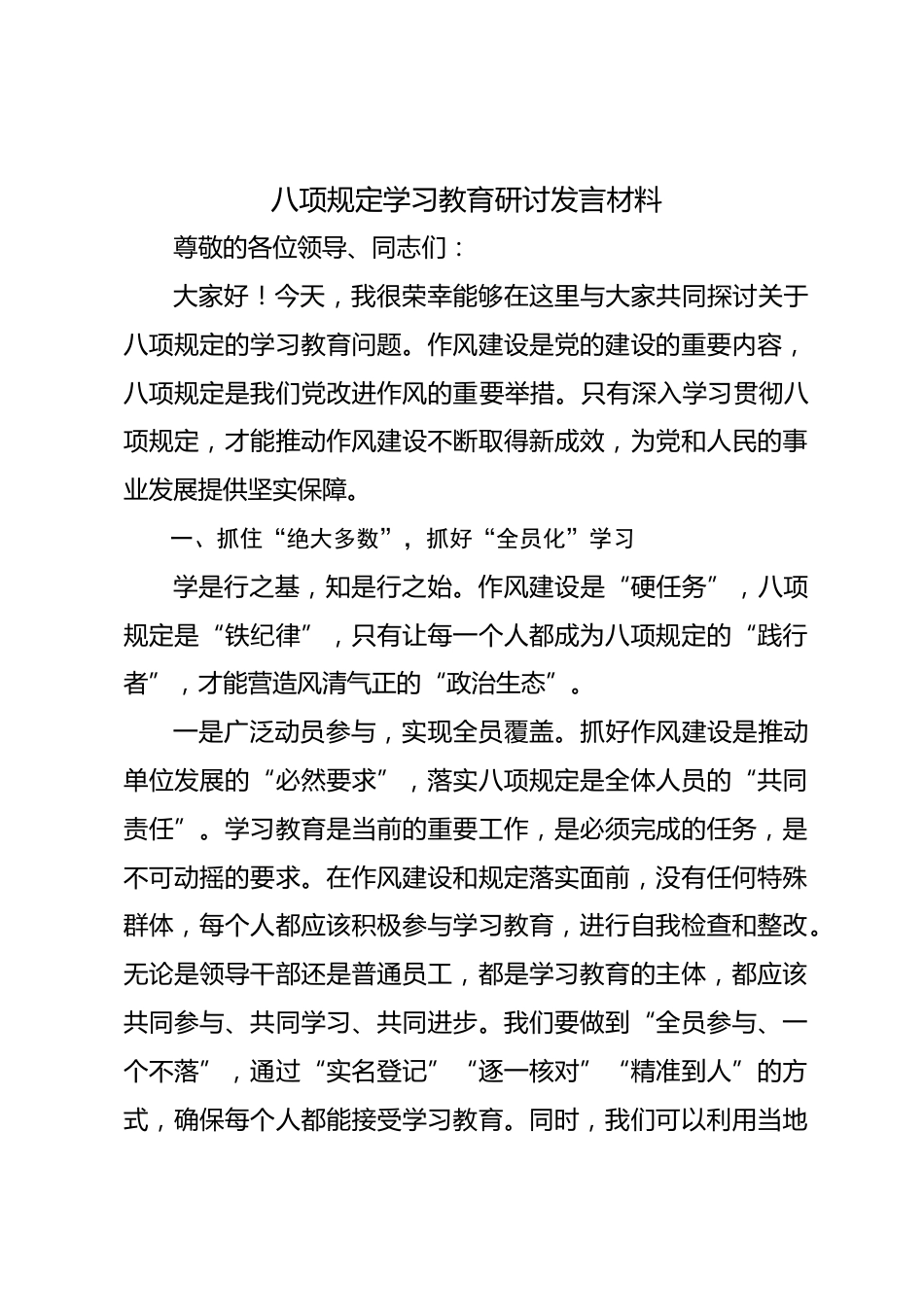 八項規(guī)定學(xué)習(xí)教育研討發(fā)言材料尊敬的各位領(lǐng)導(dǎo)、同志們:大家好!今天,我很榮幸能夠在這里與大家共同探討關(guān)于八項規(guī)定的學(xué)習(xí)教育問題。作風(fēng)建設(shè)是黨的建設(shè)的重要內(nèi)容,八項規(guī)定是我們黨改進(jìn)作風(fēng)的重要舉措。只有深入學(xué)習(xí)貫徹八項規(guī)定,才能推動作風(fēng)建設(shè)不斷取得新成效,為黨和人民的事業(yè)發(fā)展提供堅實保障。一、抓住“絕大多數(shù)”,抓好“全員化”學(xué)習(xí)學(xué)是行之基,知是行之始。作風(fēng)建設(shè)是“硬任務(wù)”,八項規(guī)定是“鐵紀(jì)律”,只有讓每一個人都成為八項規(guī)定的“踐行者”,才能營造風(fēng)清氣正的“政治生態(tài)”。一是廣泛動員參與,實現(xiàn)全員覆蓋。抓好作風(fēng)建設(shè)是推動單位發(fā)展的“必...