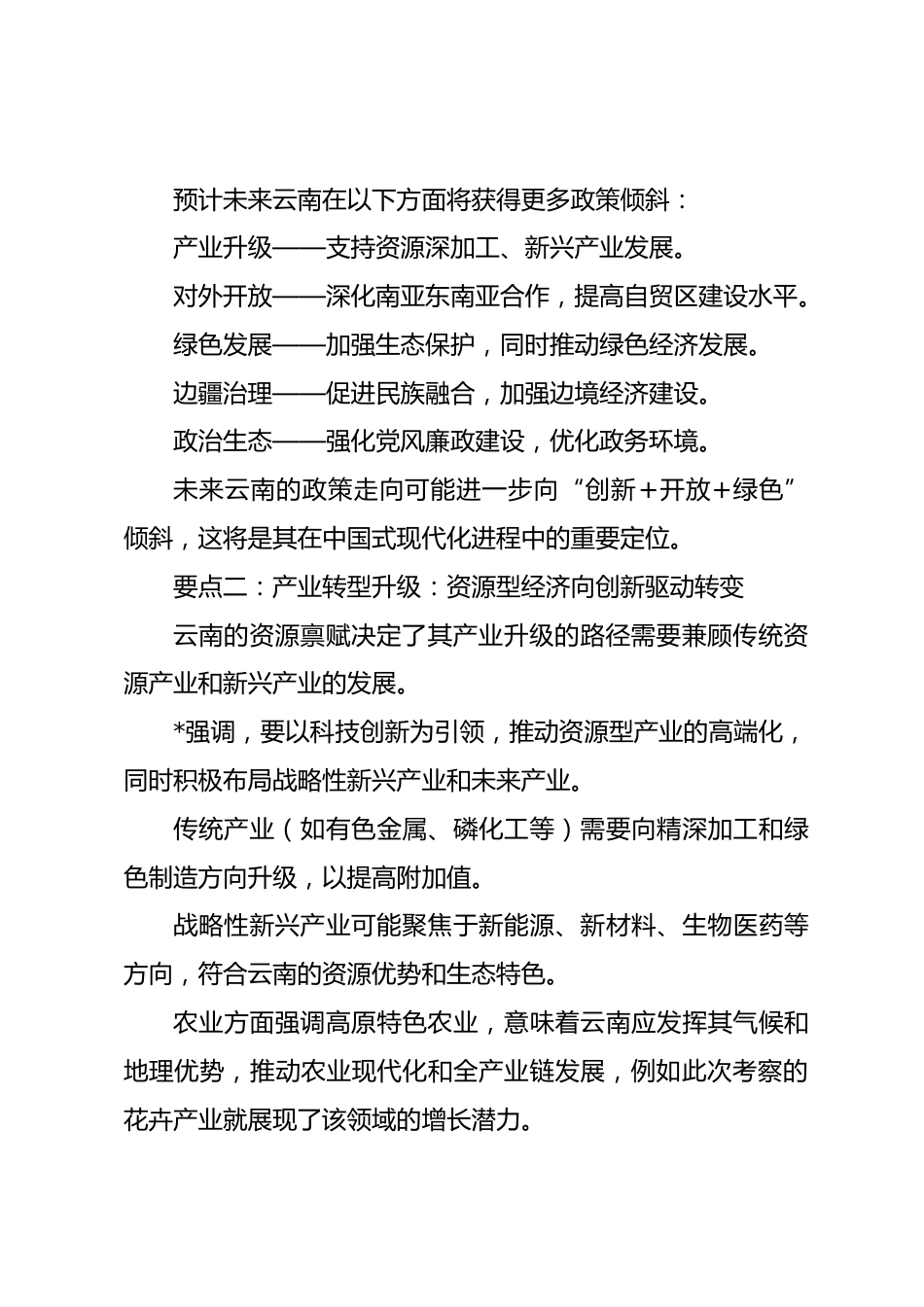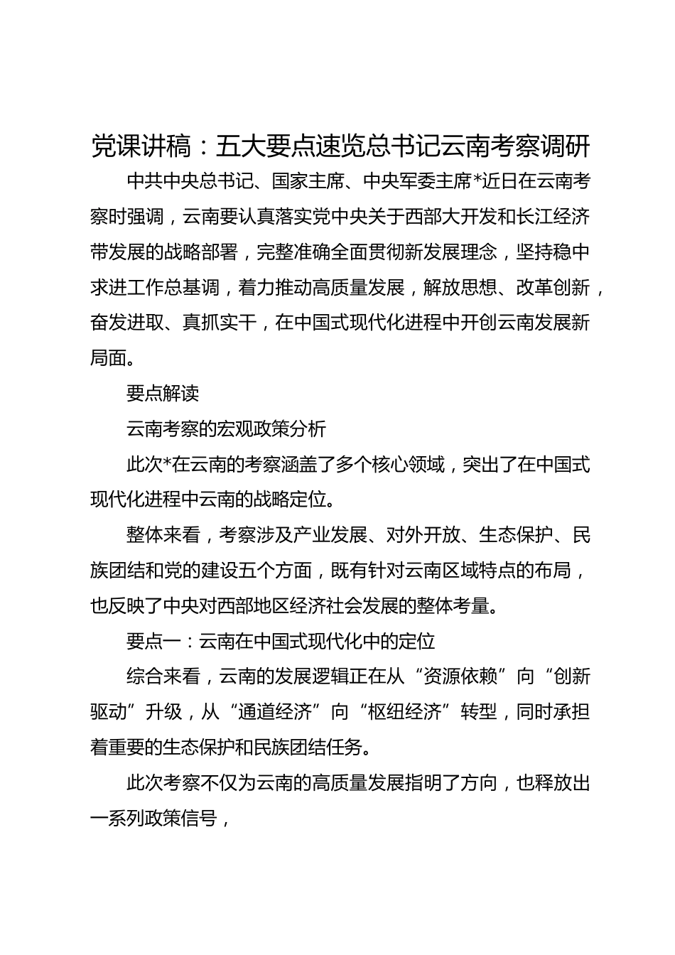 黨課講稿:五大要點速覽總書記云南考察調(diào)研中共中央總書記、國家主席、中央軍委主席*近日在云南考察時強調(diào),云南要認真落實黨中央關于西部大開發(fā)和長江經(jīng)濟帶發(fā)展的戰(zhàn)略部署,完整準確全面貫徹新發(fā)展理念,堅持穩(wěn)中求進工作總基調(diào),著力推動高質(zhì)量發(fā)展,解放思想、改革創(chuàng)新,奮發(fā)進取、真抓實干,在中國式現(xiàn)代化進程中開創(chuàng)云南發(fā)展新局面。要點解讀云南考察的宏觀政策分析此次*在云南的考察涵蓋了多個核心領域,突出了在中國式現(xiàn)代化進程中云南的戰(zhàn)略定位。整體來看,考察涉及產(chǎn)業(yè)發(fā)展、對外開放、生態(tài)保護、民族團結(jié)和黨的建設五個方面,既有針對云南區(qū)域特點的布局,也...