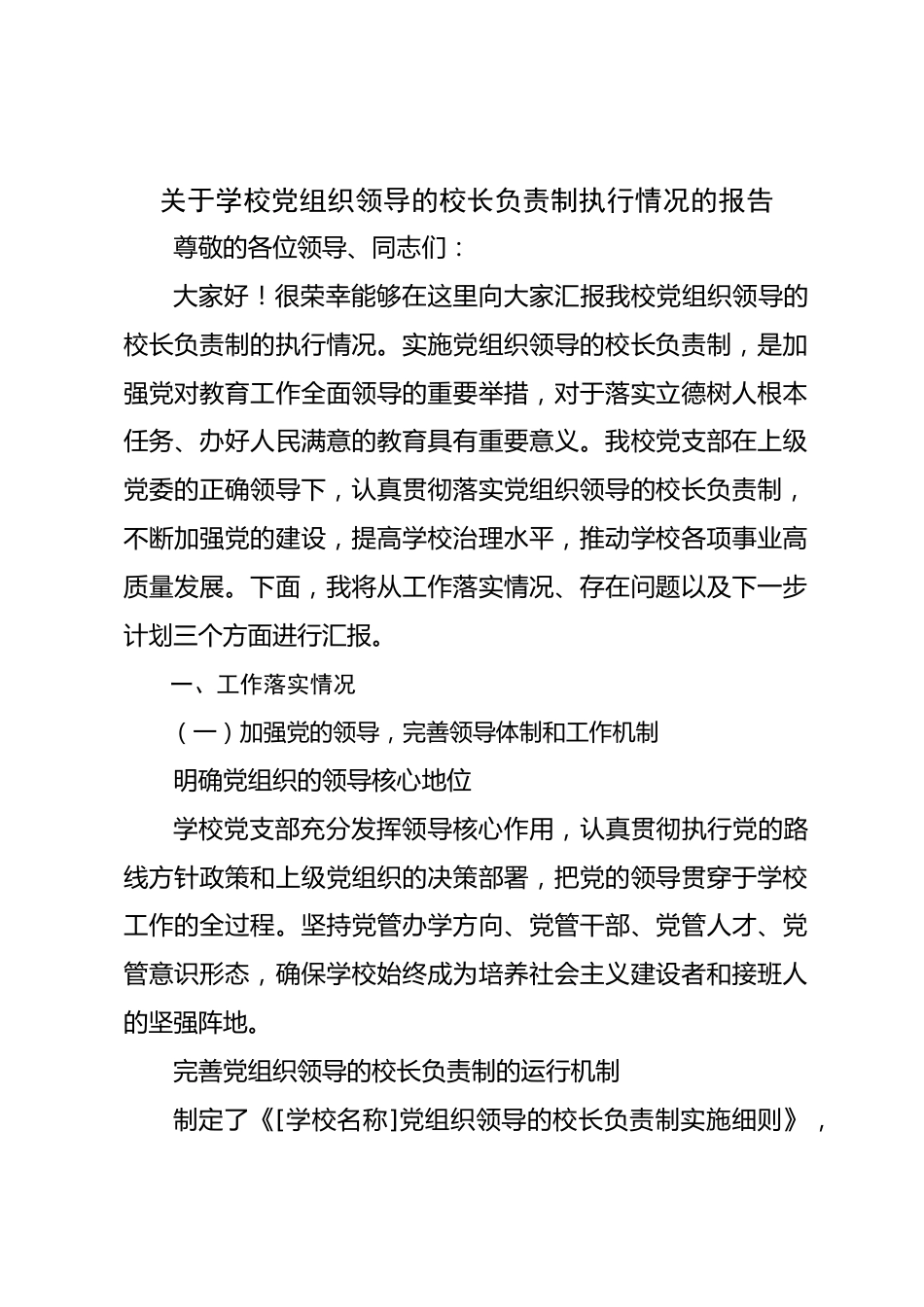 關(guān)于學(xué)校黨組織領(lǐng)導(dǎo)的校長(zhǎng)負(fù)責(zé)制執(zhí)行情況的報(bào)告尊敬的各位領(lǐng)導(dǎo)、同志們:大家好!很榮幸能夠在這里向大家匯報(bào)我校黨組織領(lǐng)導(dǎo)的校長(zhǎng)負(fù)責(zé)制的執(zhí)行情況。實(shí)施黨組織領(lǐng)導(dǎo)的校長(zhǎng)負(fù)責(zé)制,是加強(qiáng)黨對(duì)教育工作全面領(lǐng)導(dǎo)的重要舉措,對(duì)于落實(shí)立德樹人根本任務(wù)、辦好人民滿意的教育具有重要意義。我校黨支部在上級(jí)黨委的正確領(lǐng)導(dǎo)下,認(rèn)真貫徹落實(shí)黨組織領(lǐng)導(dǎo)的校長(zhǎng)負(fù)責(zé)制,不斷加強(qiáng)黨的建設(shè),提高學(xué)校治理水平,推動(dòng)學(xué)校各項(xiàng)事業(yè)高質(zhì)量發(fā)展。下面,我將從工作落實(shí)情況、存在問(wèn)題以及下一步計(jì)劃三個(gè)方面進(jìn)行匯報(bào)。一、工作落實(shí)情況(一)加強(qiáng)黨的領(lǐng)導(dǎo),完善領(lǐng)導(dǎo)體制和工作機(jī)制明確黨組...