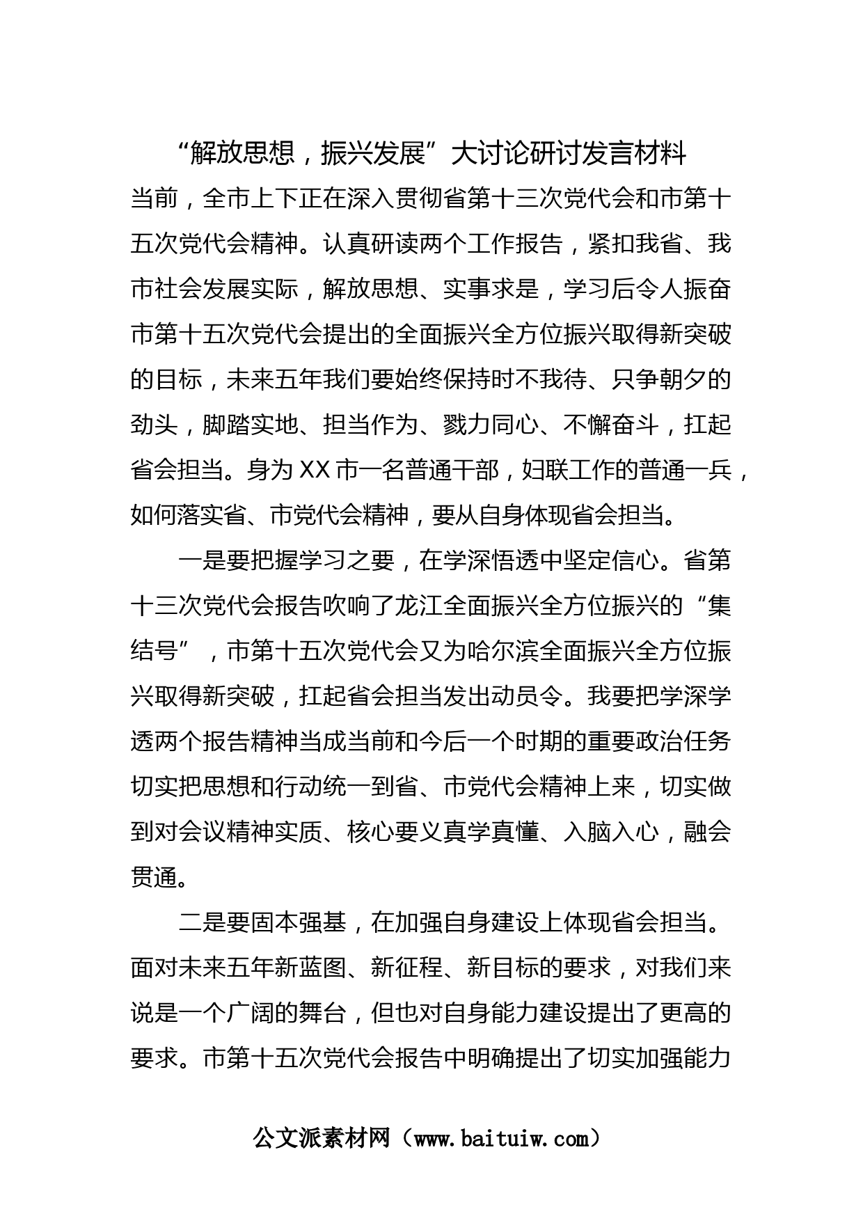 “解放思想,振興發(fā)展”大討論研討發(fā)言材料當(dāng)前,全市上下正在深入貫徹省第十三次黨代會(huì)和市第十五次黨代會(huì)精神。認(rèn)真研讀兩個(gè)工作報(bào)告,緊扣我省、我市社會(huì)發(fā)展實(shí)際,解放思想、實(shí)事求是,學(xué)習(xí)后令人振奮市第十五次黨代會(huì)提出的全面振興全方位振興取得新突破的目標(biāo),未來(lái)五年我們要始終保持時(shí)不我待、只爭(zhēng)朝夕的勁頭,腳踏實(shí)地、擔(dān)當(dāng)作為、戮力同心、不懈奮斗,扛起省會(huì)擔(dān)當(dāng)。身為XX市一名普通干部,婦聯(lián)工作的普通一兵,如何落實(shí)省、市黨代會(huì)精神,要從自身體現(xiàn)省會(huì)擔(dān)當(dāng)。一是要把握學(xué)習(xí)之要,在學(xué)深悟透中堅(jiān)定信心。省第十三次黨代會(huì)報(bào)告吹響了龍江全面振興全方位振興...