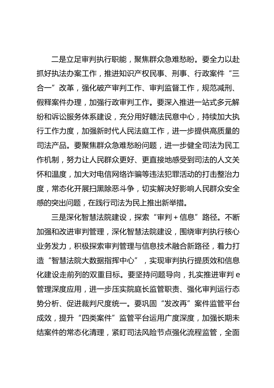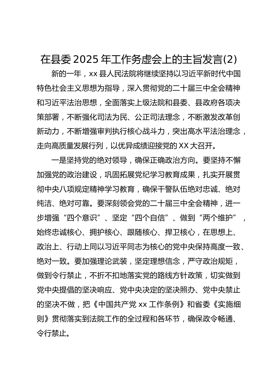 在縣委2025年工作務(wù)虛會(huì)上的主旨發(fā)言(2)新的一年,xx縣人民法院將繼續(xù)堅(jiān)持以習(xí)近平新時(shí)代中國(guó)特色社會(huì)主義思想為指導(dǎo),深入貫徹黨的二十屆三中全會(huì)精神和習(xí)近平法治思想,全面落實(shí)上級(jí)法院和縣委、縣政府各項(xiàng)決策部署,不斷強(qiáng)化司法為民、公正司法理念,不斷激發(fā)改革創(chuàng)新動(dòng)力,不斷增強(qiáng)審判執(zhí)行核心戰(zhàn)斗力,突出高水平法治理念,走向高質(zhì)量發(fā)展行列,以優(yōu)異成績(jī)迎接黨的XX大召開。一是堅(jiān)持黨的絕對(duì)領(lǐng)導(dǎo),確保正確政治方向。要堅(jiān)持不懈加強(qiáng)黨的政治建設(shè),鞏固拓展黨紀(jì)學(xué)習(xí)教育成果,扎實(shí)開展貫徹中央八項(xiàng)規(guī)定精神學(xué)習(xí)教育,確保干警隊(duì)伍絕對(duì)忠誠(chéng)、絕對(duì)純潔、絕對(duì)可靠。要...