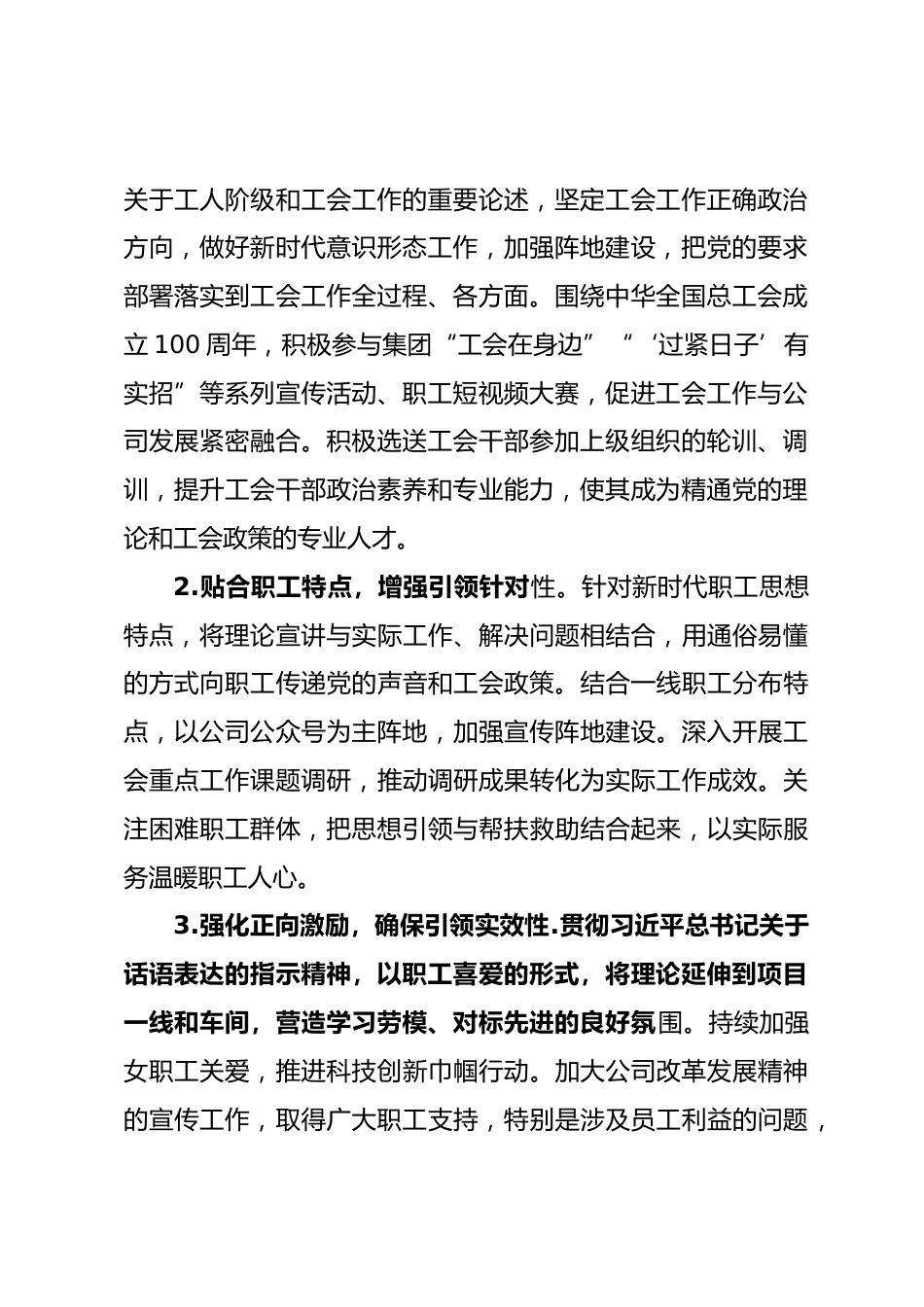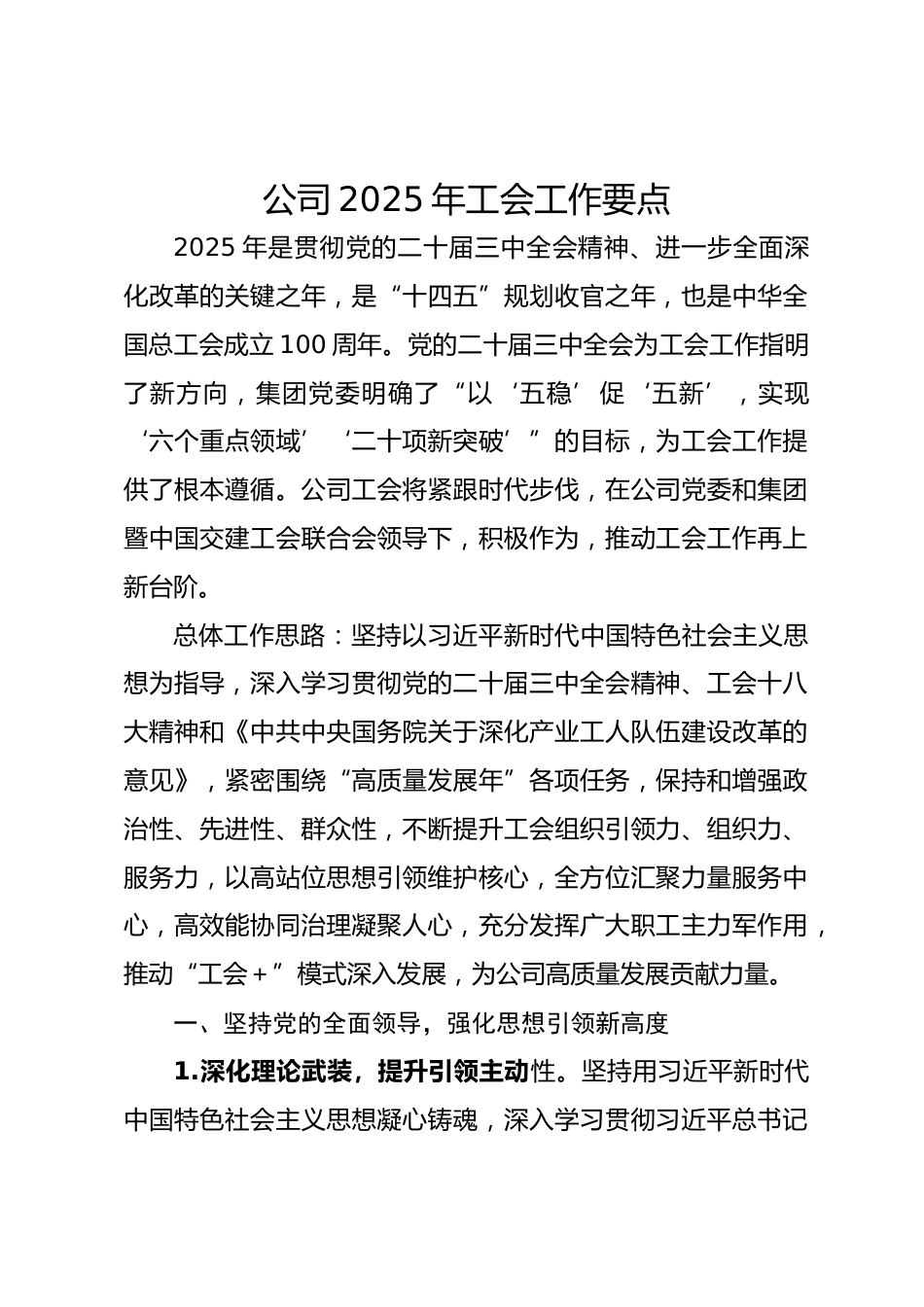 公司2025年工會工作要點2025年是貫徹黨的二十屆三中全會精神、進(jìn)一步全面深化改革的關(guān)鍵之年,是“十四五”規(guī)劃收官之年,也是中華全國總工會成立100周年。黨的二十屆三中全會為工會工作指明了新方向,集團(tuán)黨委明確了“以‘五穩(wěn)’促‘五新’,實現(xiàn)‘六個重點領(lǐng)域’‘二十項新突破’”的目標(biāo),為工會工作提供了根本遵循。公司工會將緊跟時代步伐,在公司黨委和集團(tuán)暨中國交建工會聯(lián)合會領(lǐng)導(dǎo)下,積極作為,推動工會工作再上新臺階??傮w工作思路:堅持以習(xí)近平新時代中國特色社會主義思想為指導(dǎo),深入學(xué)習(xí)貫徹黨的二十屆三中全會精神、工會十八大精神和《中共中央國務(wù)院關(guān)...