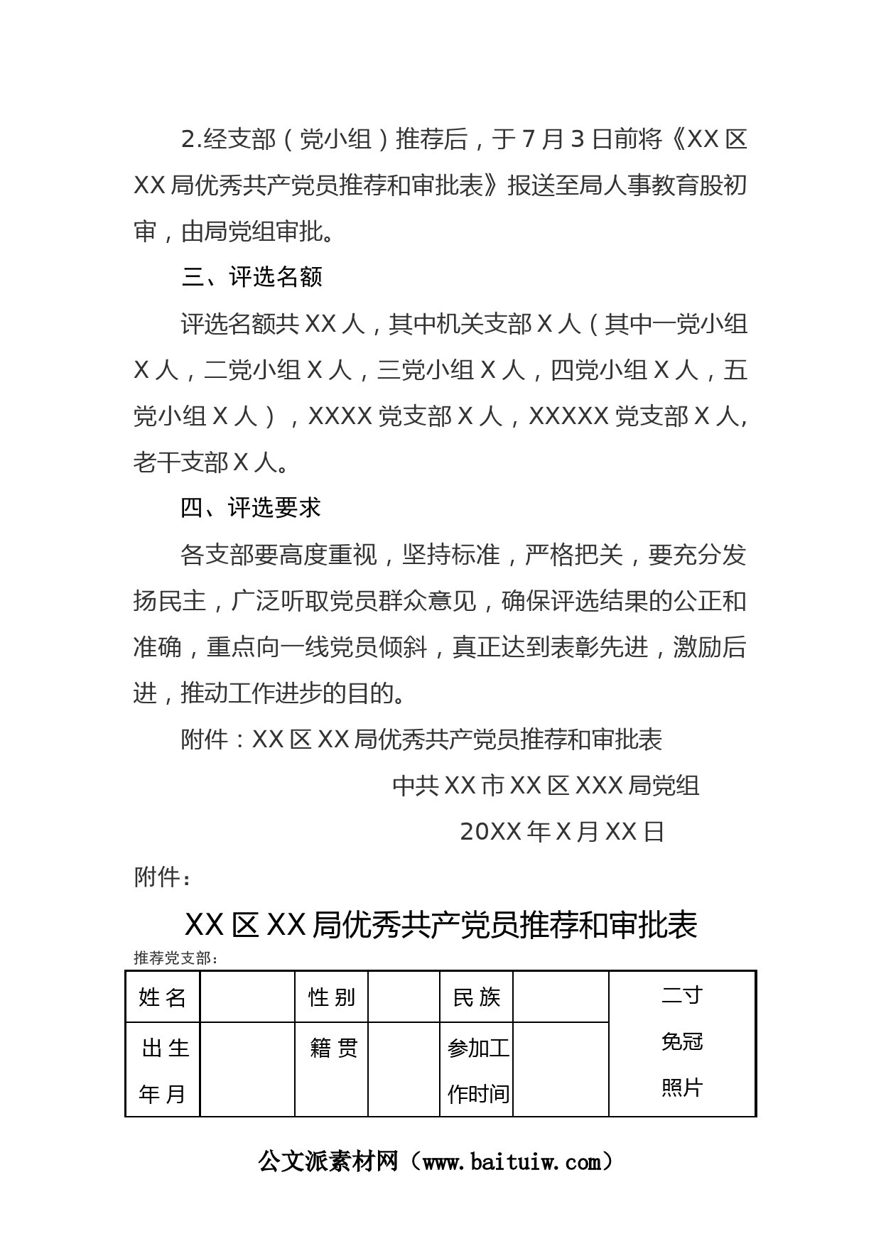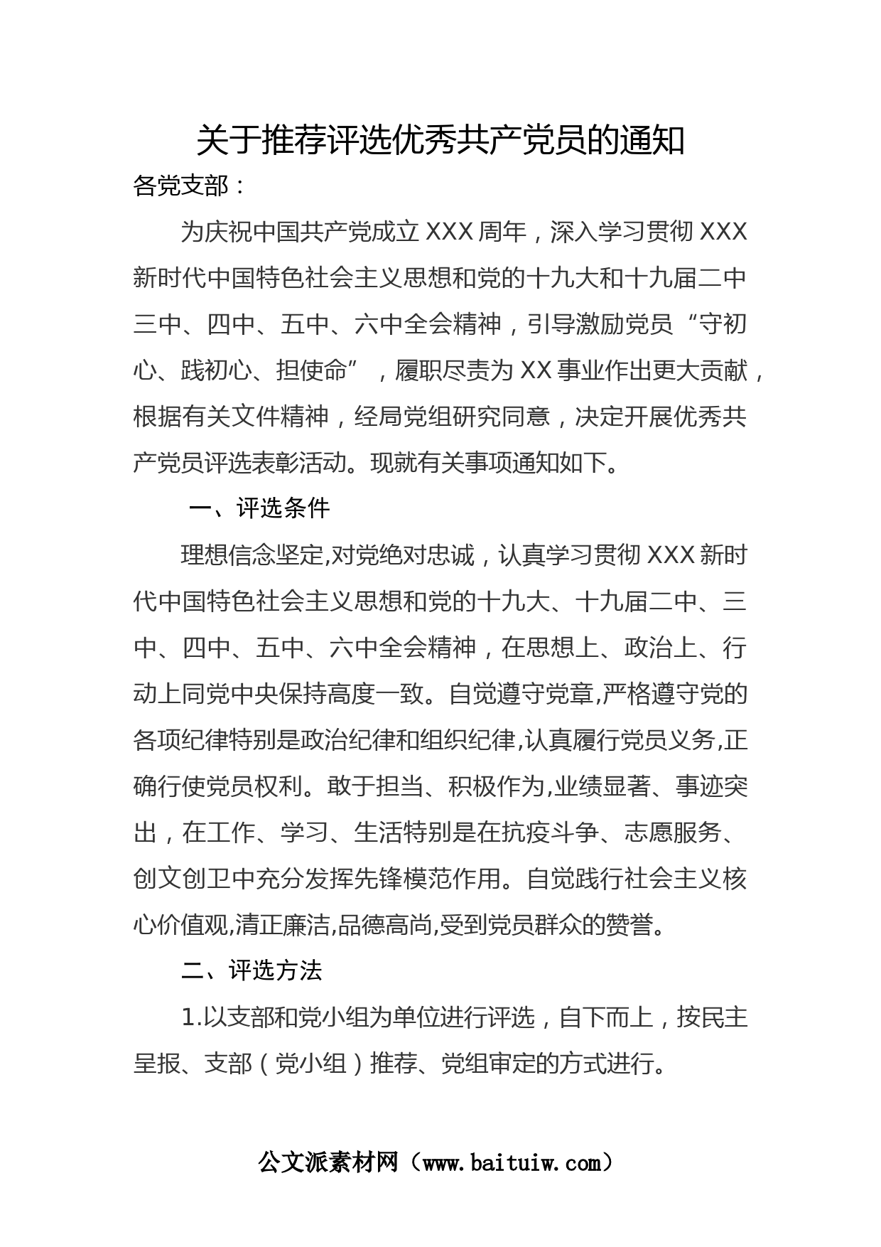 關(guān)于推薦評選優(yōu)秀共產(chǎn)黨員的通知各黨支部:為慶祝中國共產(chǎn)黨成立XXX周年,深入學(xué)習(xí)貫徹XXX新時代中國特色社會主義思想和黨的十九大和十九屆二中三中、四中、五中、六中全會精神,引導(dǎo)激勵黨員“守初心、踐初心、擔(dān)使命”,履職盡責(zé)為XX事業(yè)作出更大貢獻(xiàn),根據(jù)有關(guān)文件精神,經(jīng)局黨組研究同意,決定開展優(yōu)秀共產(chǎn)黨員評選表彰活動?,F(xiàn)就有關(guān)事項通知如下。一、評選條件理想信念堅定,對黨絕對忠誠,認(rèn)真學(xué)習(xí)貫徹XXX新時代中國特色社會主義思想和黨的十九大、十九屆二中、三中、四中、五中、六中全會精神,在思想上、政治上、行動上同黨中央保持高度一致。自覺遵守黨章,嚴(yán)格...