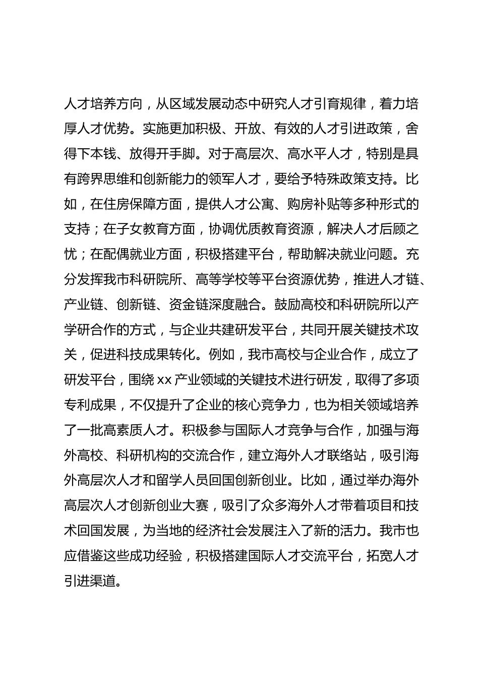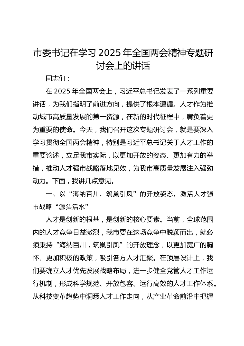 市委書記在學(xué)習(xí)2025年全國(guó)兩會(huì)精神專題研討會(huì)上的講話同志們:在2025年全國(guó)兩會(huì)上,習(xí)近平總書記發(fā)表了一系列重要講話,為我們指明了前進(jìn)方向,提供了根本遵循。人才作為推動(dòng)城市高質(zhì)量發(fā)展的第一資源,在新的時(shí)代征程中,肩負(fù)著更為重要的使命。今天,我們召開這次專題研討會(huì),就是要深入學(xué)習(xí)貫徹全國(guó)兩會(huì)精神,特別是習(xí)近平總書記關(guān)于人才工作的重要論述,立足我市實(shí)際,以更加開放的姿態(tài)、更加有力的舉措,推動(dòng)人才強(qiáng)市戰(zhàn)略落地見效,為我市高質(zhì)量發(fā)展注入強(qiáng)勁動(dòng)力。下面,我講幾點(diǎn)意見。一、以“海納百川,筑巢引鳳”的開放姿態(tài),激活人才強(qiáng)市戰(zhàn)略“源頭活水”人才是...