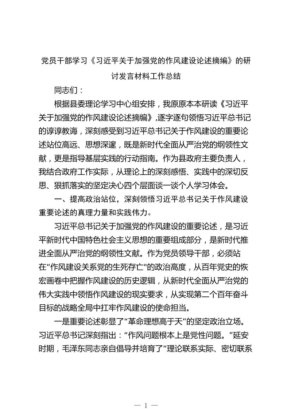 黨員干部學(xué)習(xí)《習(xí)近平關(guān)于加強(qiáng)黨的作風(fēng)建設(shè)論述摘編》的研討發(fā)言材料工作總結(jié)同志們:根據(jù)縣委理論學(xué)習(xí)中心組安排,我原原本本研讀《習(xí)近平關(guān)于加強(qiáng)黨的作風(fēng)建設(shè)論述摘編》,逐字逐句領(lǐng)悟習(xí)近平總書記的諄諄教誨,深刻感受到習(xí)近平總書記關(guān)于作風(fēng)建設(shè)的重要論述站位高遠(yuǎn)、思想深邃,既是新時代全面從嚴(yán)治黨的綱領(lǐng)性文獻(xiàn),更是指導(dǎo)基層實(shí)踐的行動指南。作為縣政府主要負(fù)責(zé)人,我結(jié)合政府工作實(shí)際,從理論上的深刻感悟、實(shí)踐中的深切反思、狠抓落實(shí)的堅(jiān)定決心四個層面談一談個人學(xué)習(xí)體會。一、提高政治站位,深刻領(lǐng)悟習(xí)近平總書記關(guān)于作風(fēng)建設(shè)重要論述的真理力量和實(shí)踐偉力...