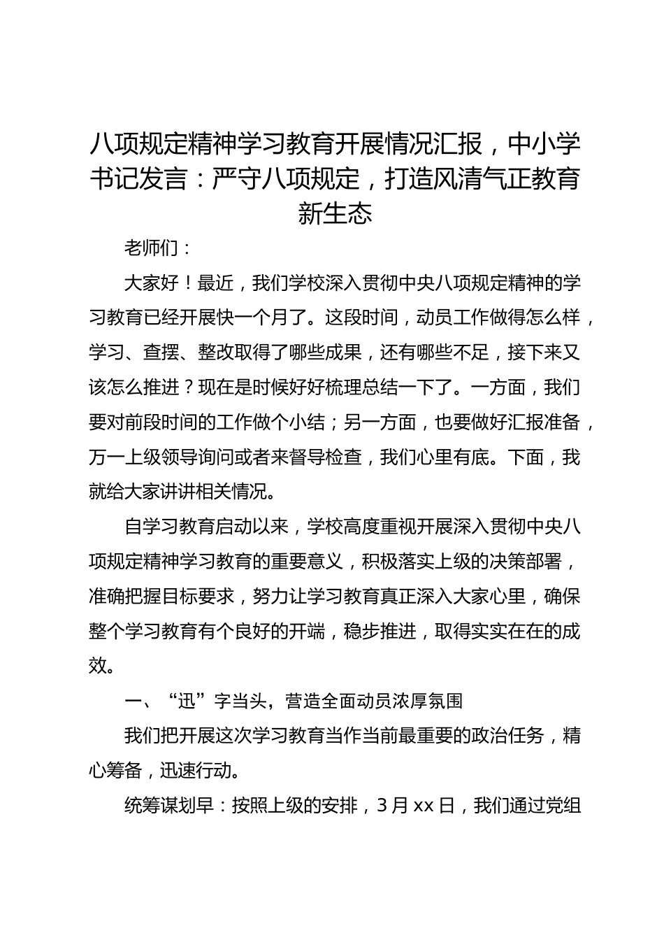 八項規(guī)定精神學(xué)習(xí)教育開展情況匯報,中小學(xué)書記發(fā)言:嚴(yán)守八項規(guī)定,打造風(fēng)清氣正教育新生態(tài)VIP免費