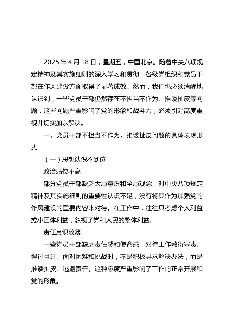 2025年4月18日,星期五,中國北京。隨著中央八項規(guī)定精神及其實施細則的深入學(xué)習(xí)和貫徹,各級黨組織和黨員干部在作風(fēng)建設(shè)方面取得了顯著成效。然而,我們也必須清醒地認識到,一些黨員干部仍然存在不擔(dān)當(dāng)不作為、推諉扯皮等問題,這些問題嚴重影響了黨的形象和戰(zhàn)斗力,必須引起高度重視并切實加以解決。一、黨員干部不擔(dān)當(dāng)不作為、推諉扯皮問題的具體表現(xiàn)形式(一)思想認識不到位政治站位不高部分黨員干部缺乏大局意識和全局觀念,對中央八項規(guī)定精神及其實施細則的重要性認識不足,沒有將其作為加強黨的作風(fēng)建設(shè)的重要內(nèi)容來對待。在工作中,往往只考慮個人利益或小團...
