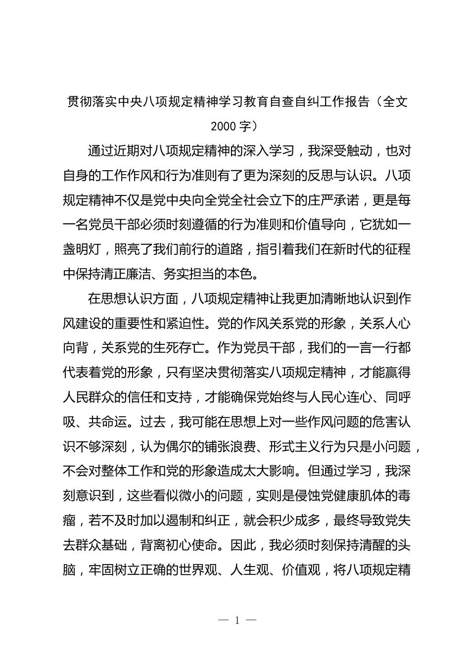 貫徹落實(shí)中央八項(xiàng)規(guī)定精神學(xué)習(xí)教育自查自糾工作報(bào)告(全文2000字)通過(guò)近期對(duì)八項(xiàng)規(guī)定精神的深入學(xué)習(xí),我深受觸動(dòng),也對(duì)自身的工作作風(fēng)和行為準(zhǔn)則有了更為深刻的反思與認(rèn)識(shí)。八項(xiàng)規(guī)定精神不僅是黨中央向全黨全社會(huì)立下的莊嚴(yán)承諾,更是每一名黨員干部必須時(shí)刻遵循的行為準(zhǔn)則和價(jià)值導(dǎo)向,它猶如一盞明燈,照亮了我們前行的道路,指引著我們?cè)谛聲r(shí)代的征程中保持清正廉潔、務(wù)實(shí)擔(dān)當(dāng)?shù)谋旧?。在思想認(rèn)識(shí)方面,八項(xiàng)規(guī)定精神讓我更加清晰地認(rèn)識(shí)到作風(fēng)建設(shè)的重要性和緊迫性。黨的作風(fēng)關(guān)系黨的形象,關(guān)系人心向背,關(guān)系黨的生死存亡。作為黨員干部,我們的一言一行都代表著黨的形...