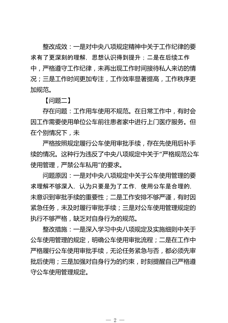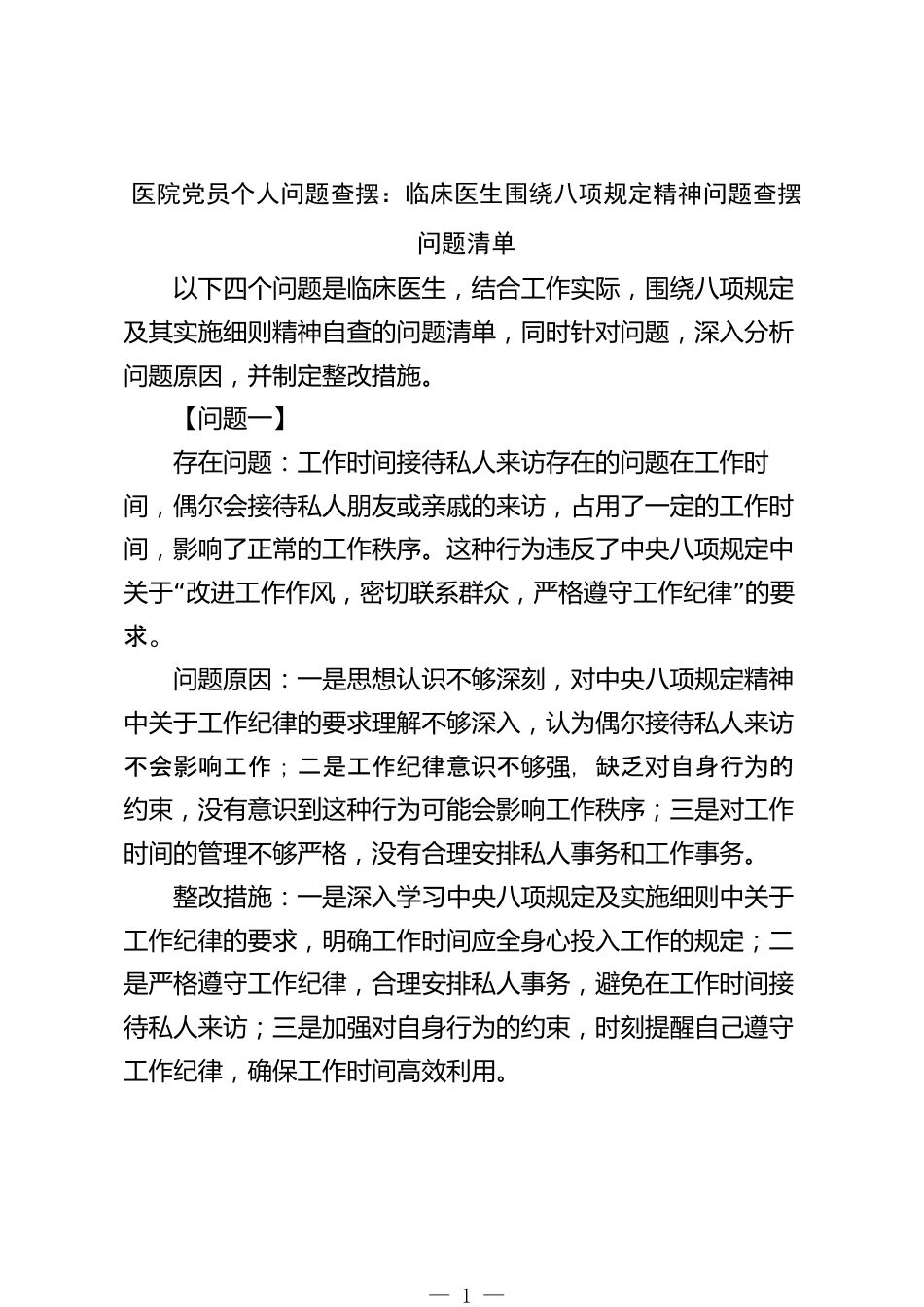 醫(yī)院黨員個(gè)人問題查擺:臨床醫(yī)生圍繞八項(xiàng)規(guī)定精神問題查擺問題清單以下四個(gè)問題是臨床醫(yī)生,結(jié)合工作實(shí)際,圍繞八項(xiàng)規(guī)定及其實(shí)施細(xì)則精神自查的問題清單,同時(shí)針對(duì)問題,深入分析問題原因,并制定整改措施?!締栴}一】存在問題:工作時(shí)間接待私人來訪存在的問題在工作時(shí)間,偶爾會(huì)接待私人朋友或親戚的來訪,占用了一定的工作時(shí)間,影響了正常的工作秩序。這種行為違反了中央八項(xiàng)規(guī)定中“”關(guān)于改進(jìn)工作作風(fēng),密切聯(lián)系群眾,嚴(yán)格遵守工作紀(jì)律的要求。問題原因:一是思想認(rèn)識(shí)不夠深刻,對(duì)中央八項(xiàng)規(guī)定精神中關(guān)于工作紀(jì)律的要求理解不夠深入,認(rèn)為偶爾接待私人來訪不會(huì)影響...