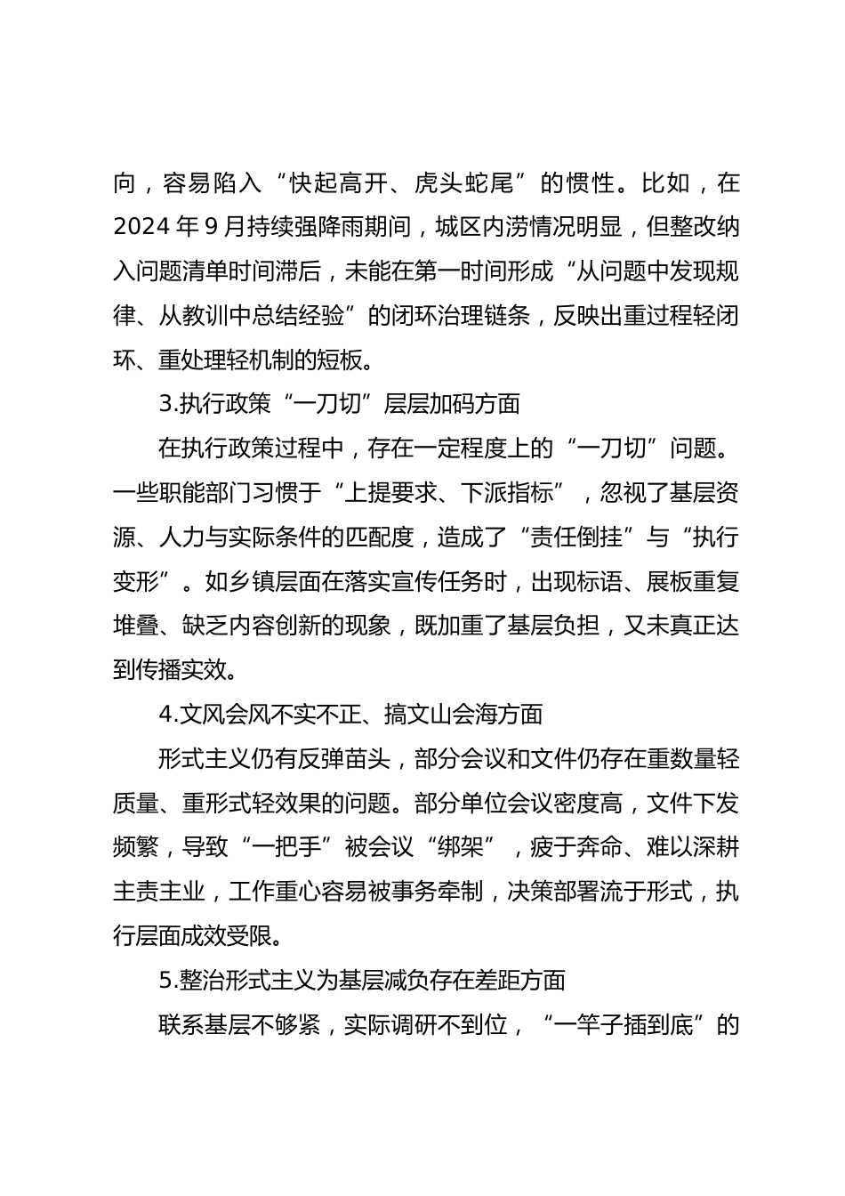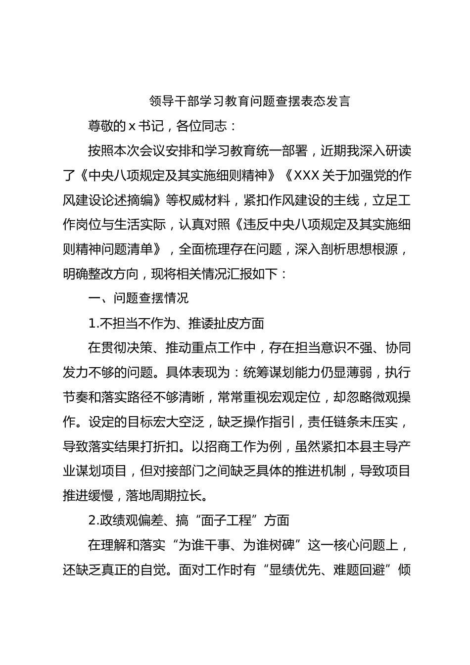 領(lǐng)導(dǎo)干部學(xué)習(xí)教育問題查擺表態(tài)發(fā)言尊敬的x書記,各位同志:按照本次會(huì)議安排和學(xué)習(xí)教育統(tǒng)一部署,近期我深入研讀了《中央八項(xiàng)規(guī)定及其實(shí)施細(xì)則精神》《XXX關(guān)于加強(qiáng)黨的作風(fēng)建設(shè)論述摘編》等權(quán)威材料,緊扣作風(fēng)建設(shè)的主線,立足工作崗位與生活實(shí)際,認(rèn)真對(duì)照《違反中央八項(xiàng)規(guī)定及其實(shí)施細(xì)則精神問題清單》,全面梳理存在問題,深入剖析思想根源,明確整改方向,現(xiàn)將相關(guān)情況匯報(bào)如下:一、問題查擺情況1.不擔(dān)當(dāng)不作為、推諉扯皮方面在貫徹決策、推動(dòng)重點(diǎn)工作中,存在擔(dān)當(dāng)意識(shí)不強(qiáng)、協(xié)同發(fā)力不夠的問題。具體表現(xiàn)為:統(tǒng)籌謀劃能力仍顯薄弱,執(zhí)行節(jié)奏和落實(shí)路徑不夠清晰,常...