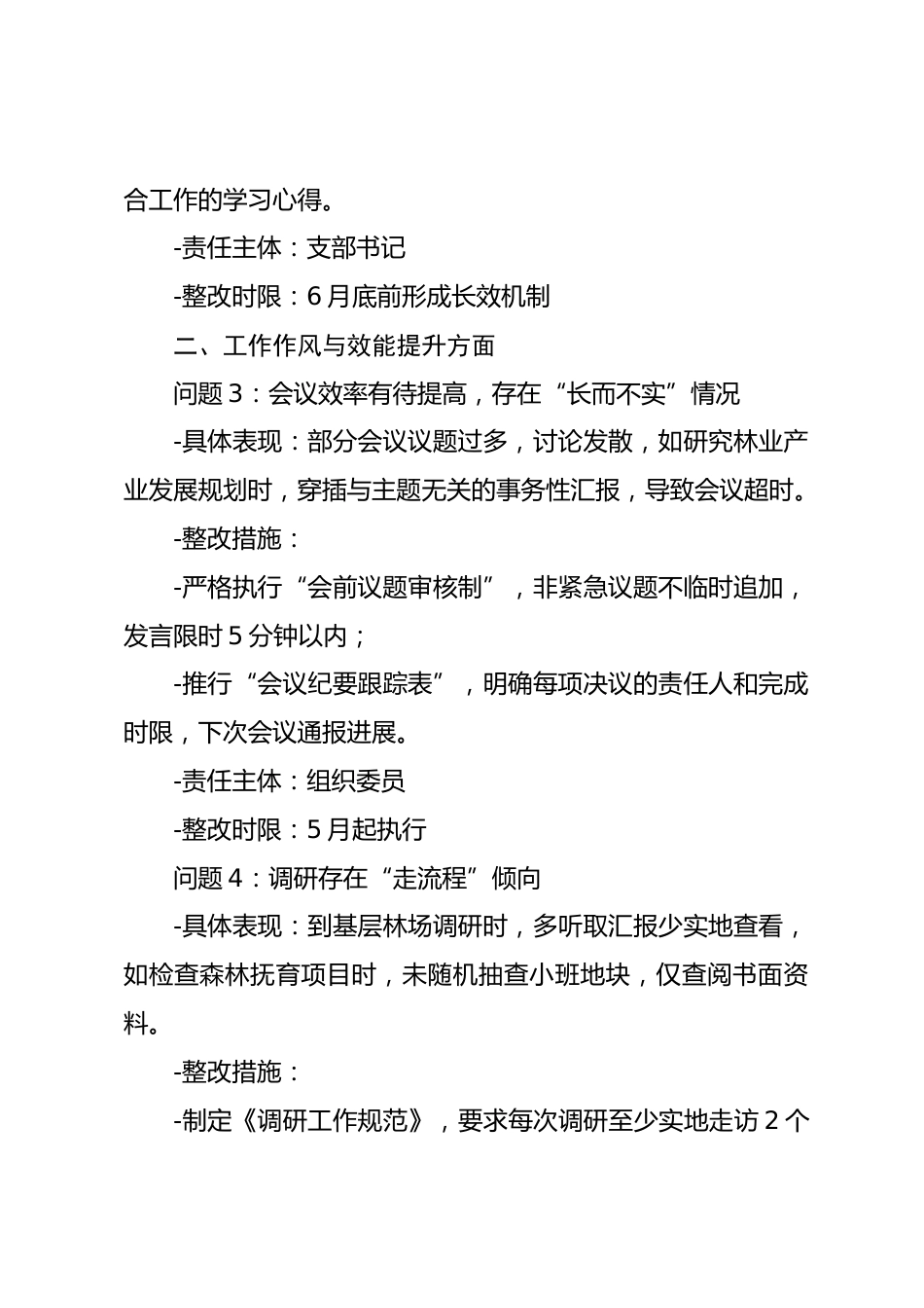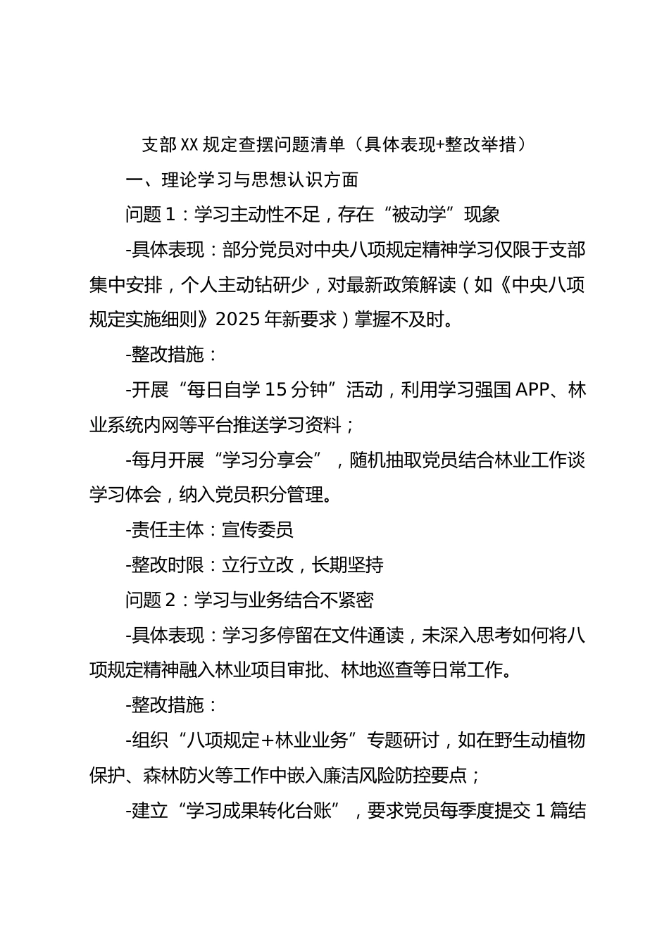 支部XX規(guī)定查擺問題清單(具體表現(xiàn)+整改舉措)一、理論學(xué)習(xí)與思想認(rèn)識方面問題1:學(xué)習(xí)主動(dòng)性不足,存在“被動(dòng)學(xué)”現(xiàn)象-具體表現(xiàn):部分黨員對中央八項(xiàng)規(guī)定精神學(xué)習(xí)僅限于支部集中安排,個(gè)人主動(dòng)鉆研少,對最新政策解讀(如《中央八項(xiàng)規(guī)定實(shí)施細(xì)則》2025年新要求)掌握不及時(shí)。-整改措施:-開展“每日自學(xué)15分鐘”活動(dòng),利用學(xué)習(xí)強(qiáng)國APP、林業(yè)系統(tǒng)內(nèi)網(wǎng)等平臺推送學(xué)習(xí)資料;-每月開展“學(xué)習(xí)分享會”,隨機(jī)抽取黨員結(jié)合林業(yè)工作談學(xué)習(xí)體會,納入黨員積分管理。-責(zé)任主體:宣傳委員-整改時(shí)限:立行立改,長期堅(jiān)持問題2:學(xué)習(xí)與業(yè)務(wù)結(jié)合不緊密-具體表現(xiàn):學(xué)習(xí)多停留在文件通讀...