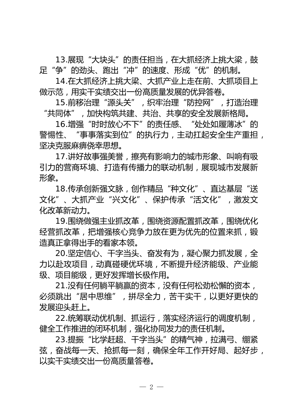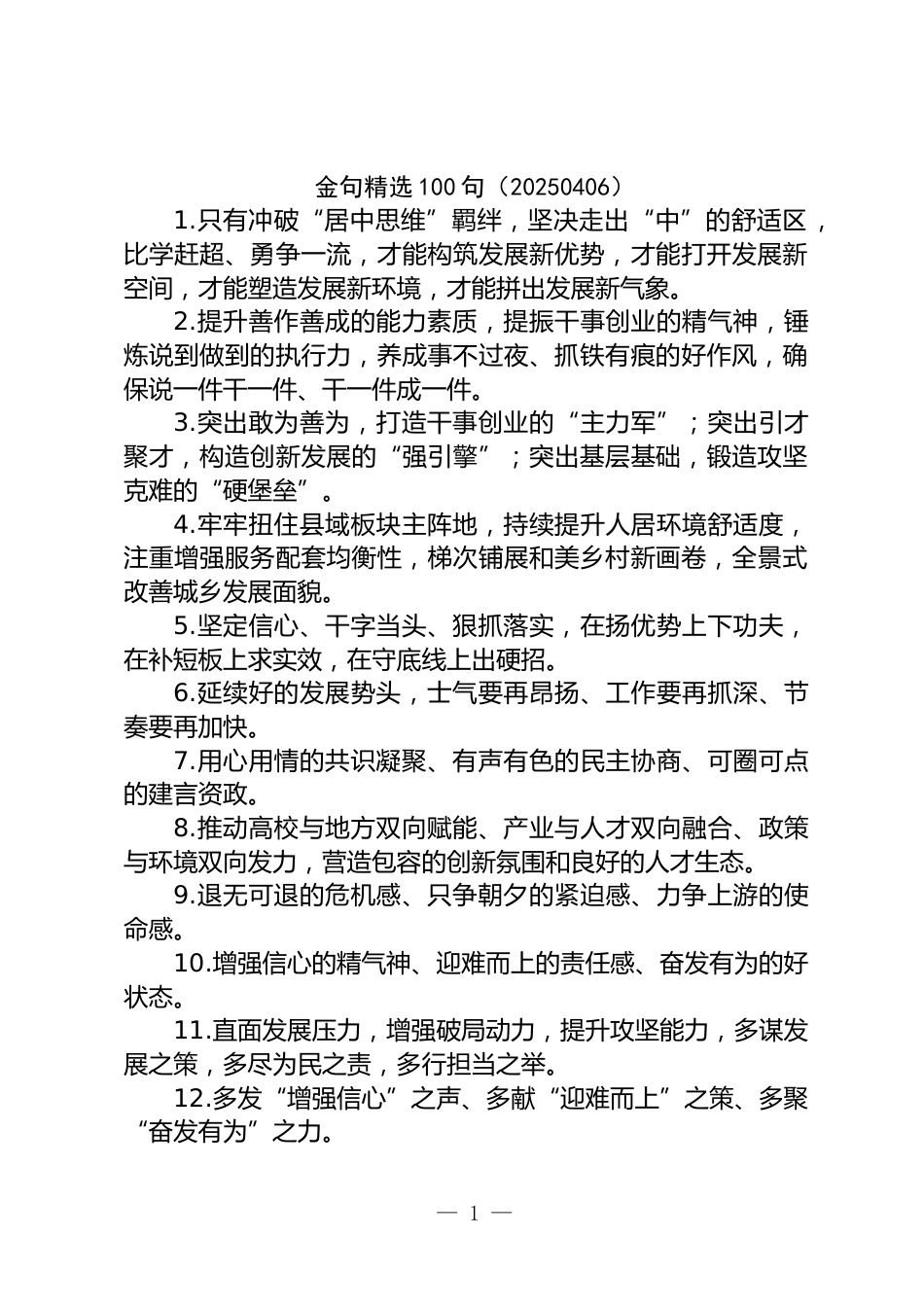 金句精選100句(20250406)1.只有沖破“居中思維”羈絆,堅決走出“中”的舒適區(qū),比學趕超、勇爭一流,才能構筑發(fā)展新優(yōu)勢,才能打開發(fā)展新空間,才能塑造發(fā)展新環(huán)境,才能拼出發(fā)展新氣象。2.提升善作善成的能力素質,提振干事創(chuàng)業(yè)的精氣神,錘煉說到做到的執(zhí)行力,養(yǎng)成事不過夜、抓鐵有痕的好作風,確保說一件干一件、干一件成一件。3.突出敢為善為,打造干事創(chuàng)業(yè)的“主力軍”;突出引才聚才,構造創(chuàng)新發(fā)展的“強引擎”;突出基層基礎,鍛造攻堅克難的“硬堡壘”。4.牢牢扭住縣域板塊主陣地,持續(xù)提升人居環(huán)境舒適度,注重增強服務配套均衡性,梯次鋪展和美鄉(xiāng)村新畫卷...