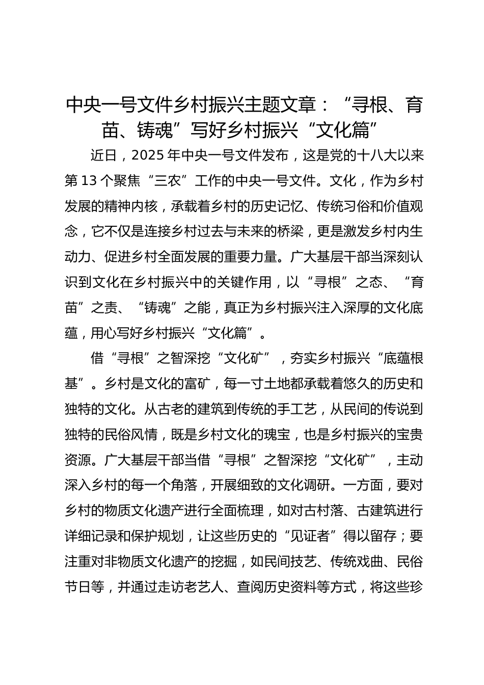 中央一號(hào)文件鄉(xiāng)村振興主題文章:“尋根、育苗、鑄魂”寫好鄉(xiāng)村振興“文化篇”近日,2025年中央一號(hào)文件發(fā)布,這是黨的十八大以來第13個(gè)聚焦“三農(nóng)”工作的中央一號(hào)文件。文化,作為鄉(xiāng)村發(fā)展的精神內(nèi)核,承載著鄉(xiāng)村的歷史記憶、傳統(tǒng)習(xí)俗和價(jià)值觀念,它不僅是連接鄉(xiāng)村過去與未來的橋梁,更是激發(fā)鄉(xiāng)村內(nèi)生動(dòng)力、促進(jìn)鄉(xiāng)村全面發(fā)展的重要力量。廣大基層干部當(dāng)深刻認(rèn)識(shí)到文化在鄉(xiāng)村振興中的關(guān)鍵作用,以“尋根”之態(tài)、“育苗”之責(zé)、“鑄魂”之能,真正為鄉(xiāng)村振興注入深厚的文化底蘊(yùn),用心寫好鄉(xiāng)村振興“文化篇”。借“尋根”之智深挖“文化礦”,夯實(shí)鄉(xiāng)村振興“底蘊(yùn)根基”。鄉(xiāng)...