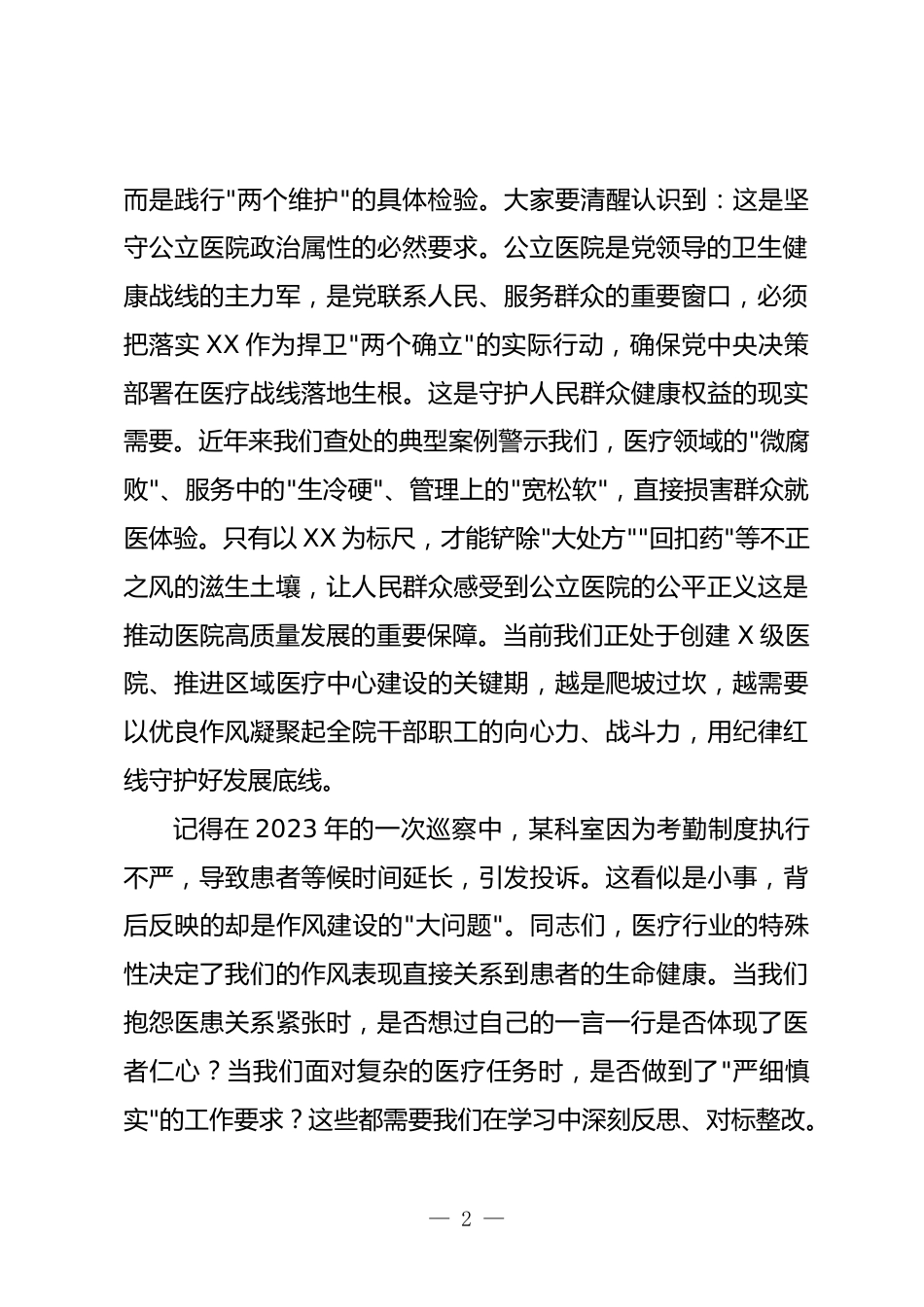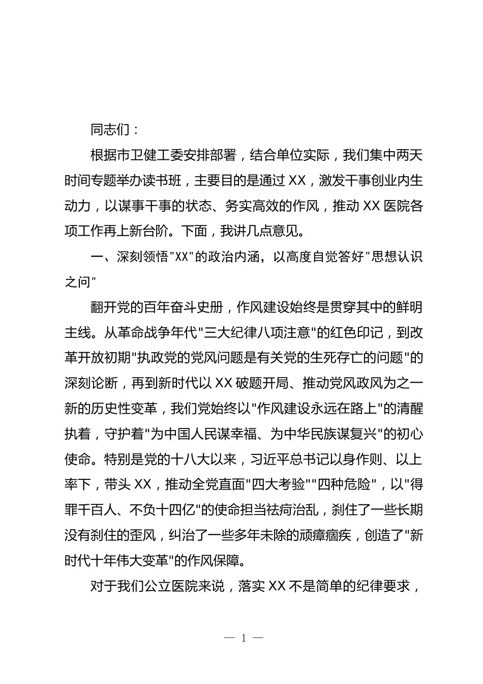 同志們:根據(jù)市衛(wèi)健工委安排部署,結(jié)合單位實際,我們集中兩天時間專題舉辦讀書班,主要目的是通過XX,激發(fā)干事創(chuàng)業(yè)內(nèi)生動力,以謀事干事的狀態(tài)、務(wù)實高效的作風(fēng),推動XX醫(yī)院各項工作再上新臺階。下面,我講幾點意見。一、深刻領(lǐng)悟"XX"的政治內(nèi)涵,以高度自覺答好"思想認(rèn)識之問"翻開黨的百年奮斗史冊,作風(fēng)建設(shè)始終是貫穿其中的鮮明主線。從革命戰(zhàn)爭年代"三大紀(jì)律八項注意"的紅色印記,到改革開放初期"執(zhí)政黨的黨風(fēng)問題是有關(guān)黨的生死存亡的問題"的深刻論斷,再到新時代以XX破題開局、推動黨風(fēng)政風(fēng)為之一新的歷史性變革,我們黨始終以"作風(fēng)建設(shè)永遠(yuǎn)在路上"的清醒執(zhí)著,守...