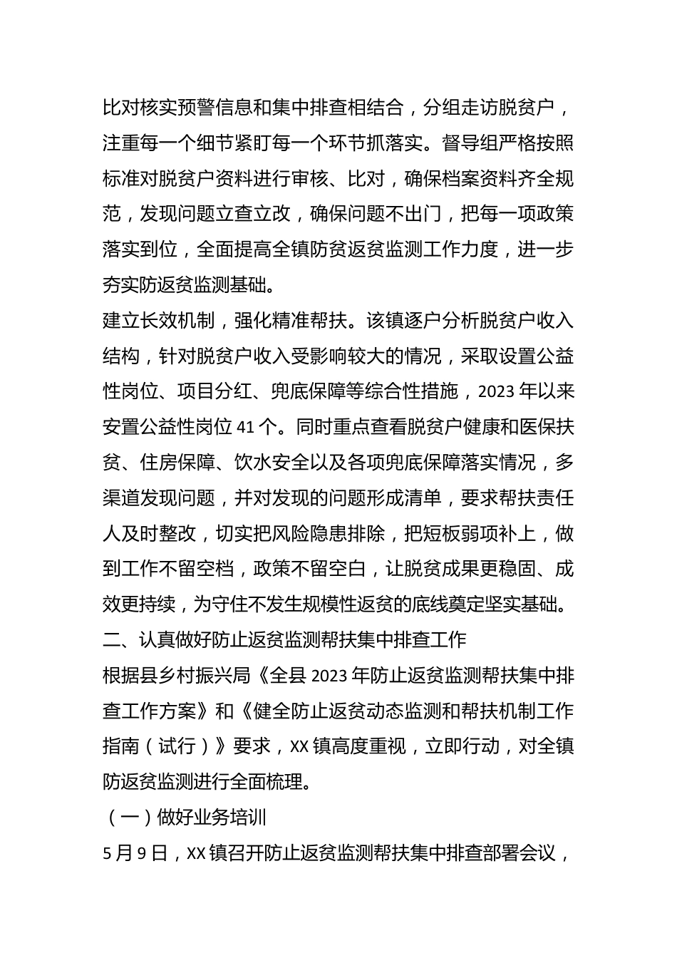 2023年XX鎮(zhèn)扶貧辦上半年工作總結(jié)為建立健全鞏固拓展脫貧攻堅(jiān)成果長(zhǎng)效機(jī)制,搞好返貧動(dòng)態(tài)監(jiān)測(cè)和常態(tài)化幫扶工作。2023年以來(lái),XX鎮(zhèn)聚焦“守底線、抓發(fā)展、促振興”的工作思路,每月開(kāi)展一輪走訪督查排查,切實(shí)入戶了解解決脫貧戶的急難愁盼需求問(wèn)題。一、扎實(shí)做好健全完善防止返貧監(jiān)測(cè)預(yù)警機(jī)制工作做好防止返貧動(dòng)態(tài)監(jiān)測(cè)和幫扶工作,是守住不發(fā)生規(guī)模性返貧底線的關(guān)鍵抓手。XX鎮(zhèn)現(xiàn)有脫貧享受政策戶798戶1222人,目前新納監(jiān)測(cè)戶11戶28人。2023年以來(lái)共比對(duì)核實(shí)縣級(jí)部門推送預(yù)警信息231人。鎮(zhèn)扶貧辦認(rèn)真落實(shí)監(jiān)測(cè)預(yù)警信息臺(tái)賬管理和對(duì)賬銷號(hào)制度對(duì)縣級(jí)反饋、干部排查以及群眾主...