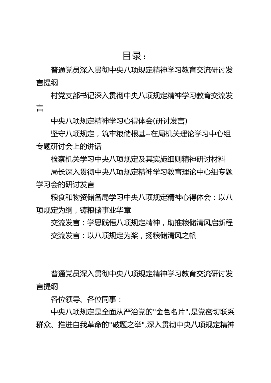 目錄:普通黨員深入貫徹中央八項(xiàng)規(guī)定精神學(xué)習(xí)教育交流研討發(fā)言提綱村黨支部書記深入貫徹中央八項(xiàng)規(guī)定精神學(xué)習(xí)教育交流發(fā)言中央八項(xiàng)規(guī)定精神學(xué)習(xí)心得體會(研討發(fā)言)堅(jiān)守八項(xiàng)規(guī)定,筑牢糧儲根基--在局機(jī)關(guān)理論學(xué)習(xí)中心組專題研討會上的講話檢察機(jī)關(guān)學(xué)習(xí)中央八項(xiàng)規(guī)定及其實(shí)施細(xì)則精神研討材料局長深入貫徹中央八項(xiàng)規(guī)定精神學(xué)習(xí)教育理論中心組專題學(xué)習(xí)會的研討發(fā)言糧食和物資儲備局學(xué)習(xí)中央八項(xiàng)規(guī)定精神心得體會:以八項(xiàng)規(guī)定為綱,鑄糧儲事業(yè)華章交流發(fā)言:學(xué)思踐悟八項(xiàng)規(guī)定精神,助推糧儲清風(fēng)啟新程交流發(fā)言:以八項(xiàng)規(guī)定為槳,揚(yáng)糧儲清風(fēng)之帆普通黨員深入貫徹中央八項(xiàng)規(guī)定精...