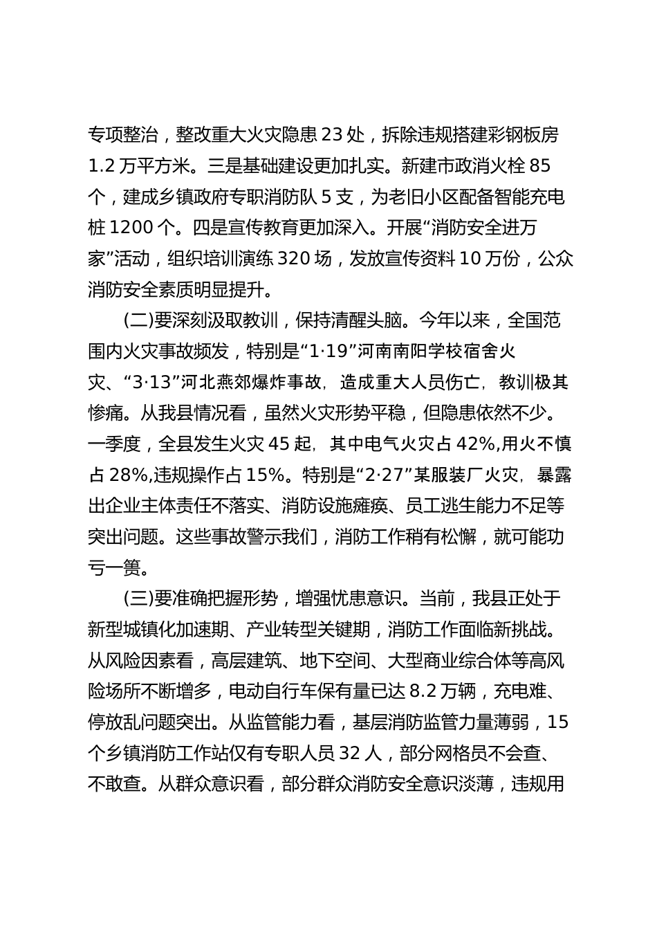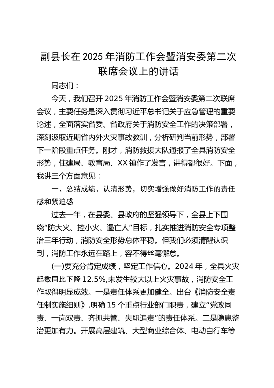 副縣長在2025年消防工作會(huì)暨消安委第二次聯(lián)席會(huì)議上的講話同志們:今天,我們召開2025年消防工作會(huì)暨消安委第二次聯(lián)席會(huì)議,主要任務(wù)是深入貫徹習(xí)近平總書記關(guān)于應(yīng)急管理的重要論述,全面落實(shí)省委、省政府關(guān)于消防安全工作的決策部署,深刻汲取近期省內(nèi)外火災(zāi)事故教訓(xùn),分析研判當(dāng)前形勢(shì),部署下一階段重點(diǎn)任務(wù)。剛才,消防救援大隊(duì)通報(bào)了全縣消防安全形勢(shì),住建局、教育局、XX鎮(zhèn)作了發(fā)言,講得都很好。下面,我講三個(gè)方面意見:一、總結(jié)成績、認(rèn)清形勢(shì),切實(shí)增強(qiáng)做好消防工作的責(zé)任感和緊迫感過去一年,在縣委、縣政府的堅(jiān)強(qiáng)領(lǐng)導(dǎo)下,全縣上下圍“”繞防大火、控小火、遏...