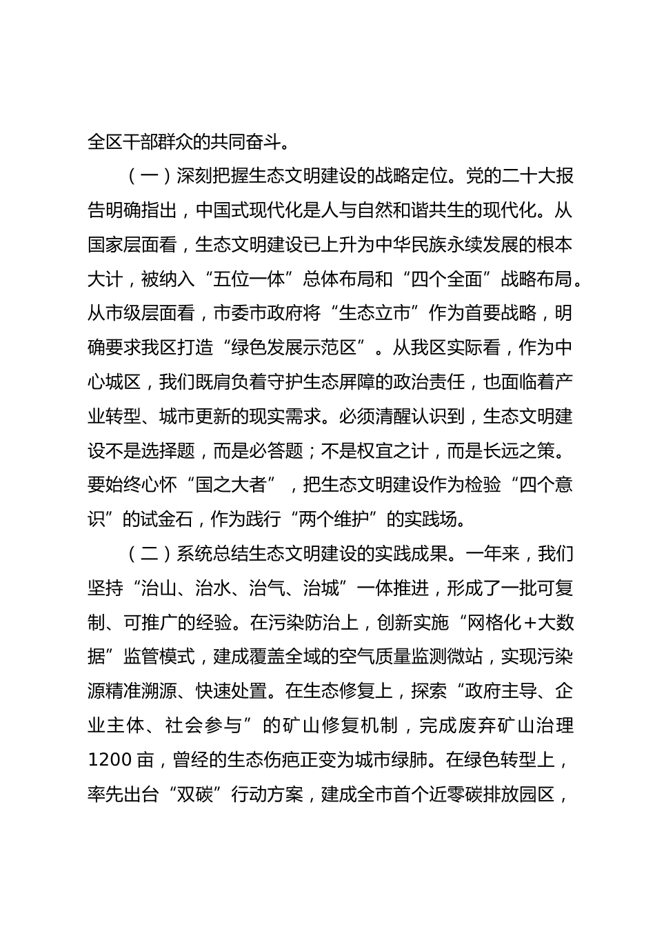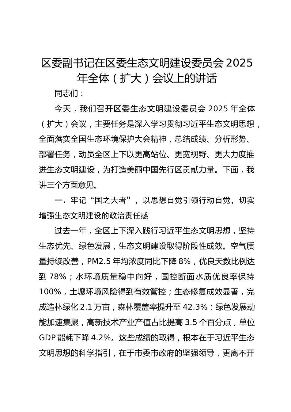 區(qū)委副書記在區(qū)委生態(tài)文明建設(shè)委員會(huì)2025年全體(擴(kuò)大)會(huì)議上的講話同志們:今天,我們召開區(qū)委生態(tài)文明建設(shè)委員會(huì)2025年全體(擴(kuò)大)會(huì)議,主要任務(wù)是深入學(xué)習(xí)貫徹習(xí)近平生態(tài)文明思想,全面落實(shí)全國生態(tài)環(huán)境保護(hù)大會(huì)精神,總結(jié)成績、分析形勢(shì)、部署任務(wù),動(dòng)員全區(qū)上下以更高站位、更寬視野、更大力度推進(jìn)生態(tài)文明建設(shè),為打造美麗中國先行區(qū)貢獻(xiàn)力量。下面,我講三個(gè)方面意見。一、牢記“國之大者”,以思想自覺引領(lǐng)行動(dòng)自覺,切實(shí)增強(qiáng)生態(tài)文明建設(shè)的政治責(zé)任感過去一年,全區(qū)上下深入踐行習(xí)近平生態(tài)文明思想,堅(jiān)持生態(tài)優(yōu)先、綠色發(fā)展,生態(tài)文明建設(shè)取得階段性成效???..