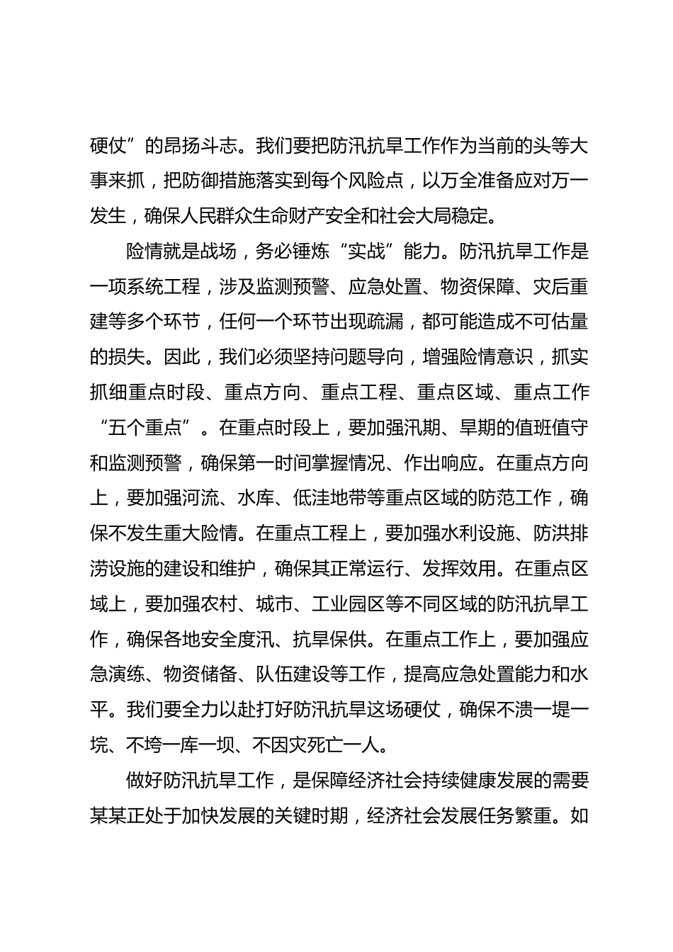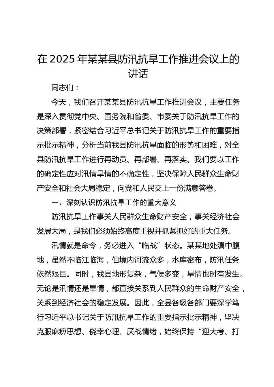 在2025年某某縣防汛抗旱工作推進會議上的講話同志們:今天,我們召開某某縣防汛抗旱工作推進會議,主要任務(wù)是深入貫徹黨中央、國務(wù)院和省委、市委關(guān)于防汛抗旱工作的決策部署,緊密結(jié)合習(xí)近平總書記關(guān)于防汛抗旱工作的重要指示批示精神,分析當(dāng)前我縣防汛抗旱面臨的形勢和困難,對全縣防汛抗旱工作進行再動員、再部署、再落實。我們要以工作的確定性應(yīng)對汛情旱情的不確定性,堅決保障人民群眾生命財產(chǎn)安全和社會大局穩(wěn)定,向黨和人民交上一份滿意答卷。一、深刻認識防汛抗旱工作的重大意義防汛抗旱工作事關(guān)人民群眾生命財產(chǎn)安全,事關(guān)經(jīng)濟社會發(fā)展大局,是我們必須始終高...
