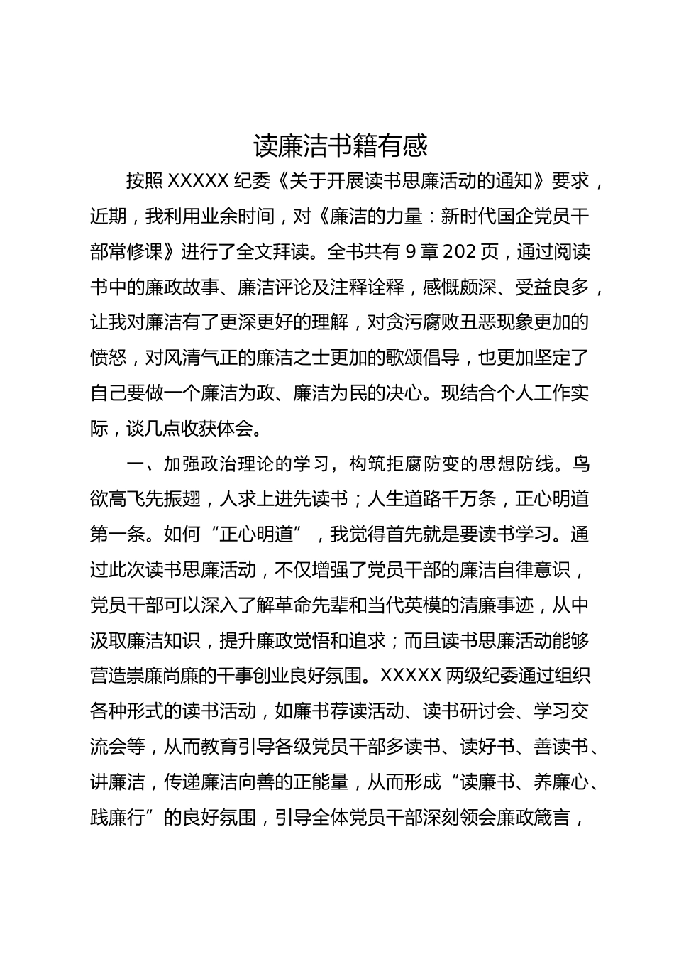 讀廉潔書籍有感按照XXXXX紀委《關于開展讀書思廉活動的通知》要求,近期,我利用業(yè)余時間,對《廉潔的力量:新時代國企黨員干部常修課》進行了全文拜讀。全書共有9章202頁,通過閱讀書中的廉政故事、廉潔評論及注釋詮釋,感慨頗深、受益良多,讓我對廉潔有了更深更好的理解,對貪污腐敗丑惡現(xiàn)象更加的憤怒,對風清氣正的廉潔之士更加的歌頌倡導,也更加堅定了自己要做一個廉潔為政、廉潔為民的決心?,F(xiàn)結合個人工作實際,談幾點收獲體會。一、加強政治理論的學習,構筑拒腐防變的思想防線。鳥欲高飛先振翅,人求上進先讀書;人生道路千萬條,正心明道第一條。如何“正心...