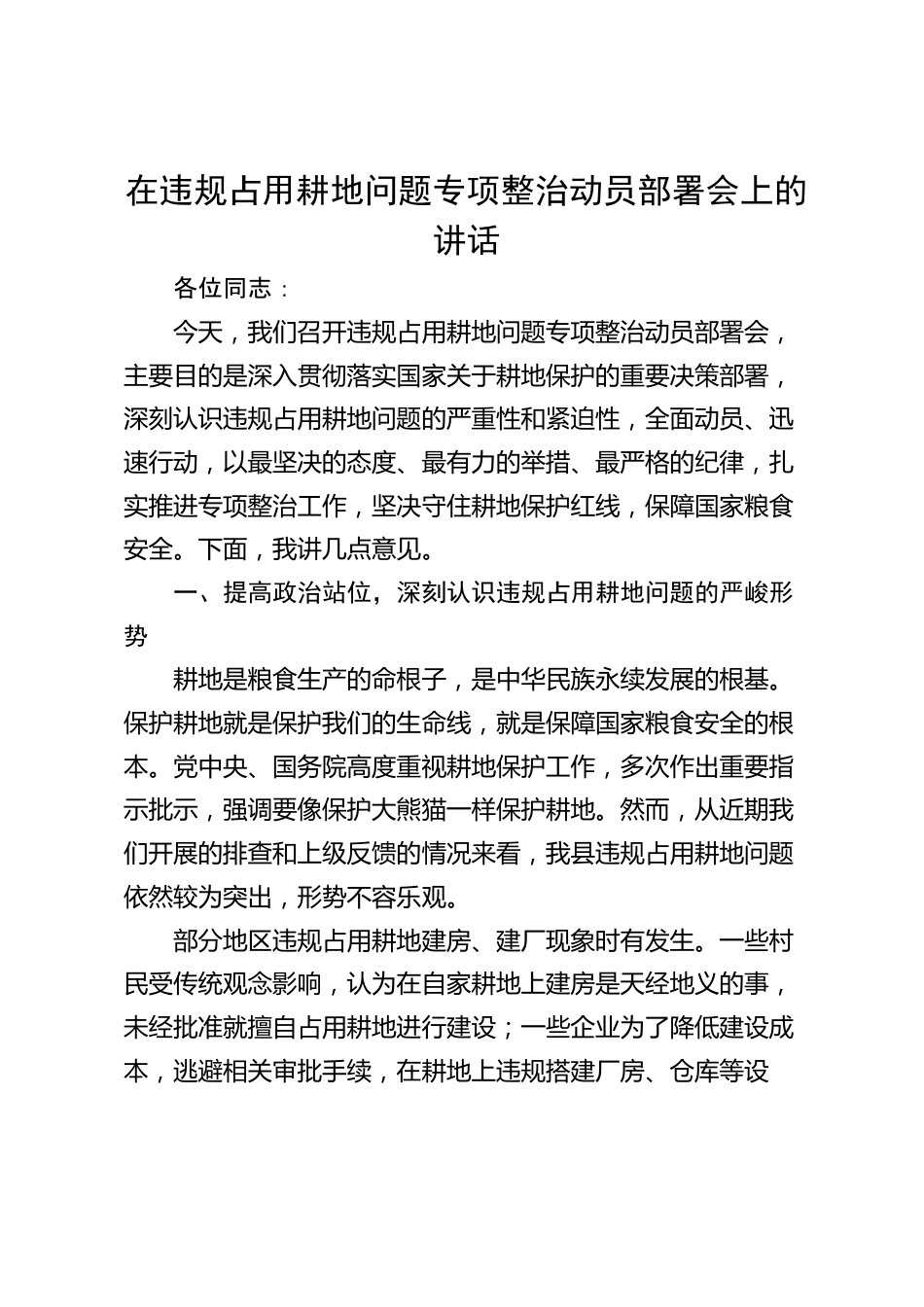 在違規(guī)占用耕地問題專項整治動員部署會上的講話各位同志:今天,我們召開違規(guī)占用耕地問題專項整治動員部署會,主要目的是深入貫徹落實國家關于耕地保護的重要決策部署,深刻認識違規(guī)占用耕地問題的嚴重性和緊迫性,全面動員、迅速行動,以最堅決的態(tài)度、最有力的舉措、最嚴格的紀律,扎實推進專項整治工作,堅決守住耕地保護紅線,保障國家糧食安全。下面,我講幾點意見。一、提高政治站位,深刻認識違規(guī)占用耕地問題的嚴峻形勢耕地是糧食生產的命根子,是中華民族永續(xù)發(fā)展的根基。保護耕地就是保護我們的生命線,就是保障國家糧食安全的根本。黨中央、國務院高度重視耕...
