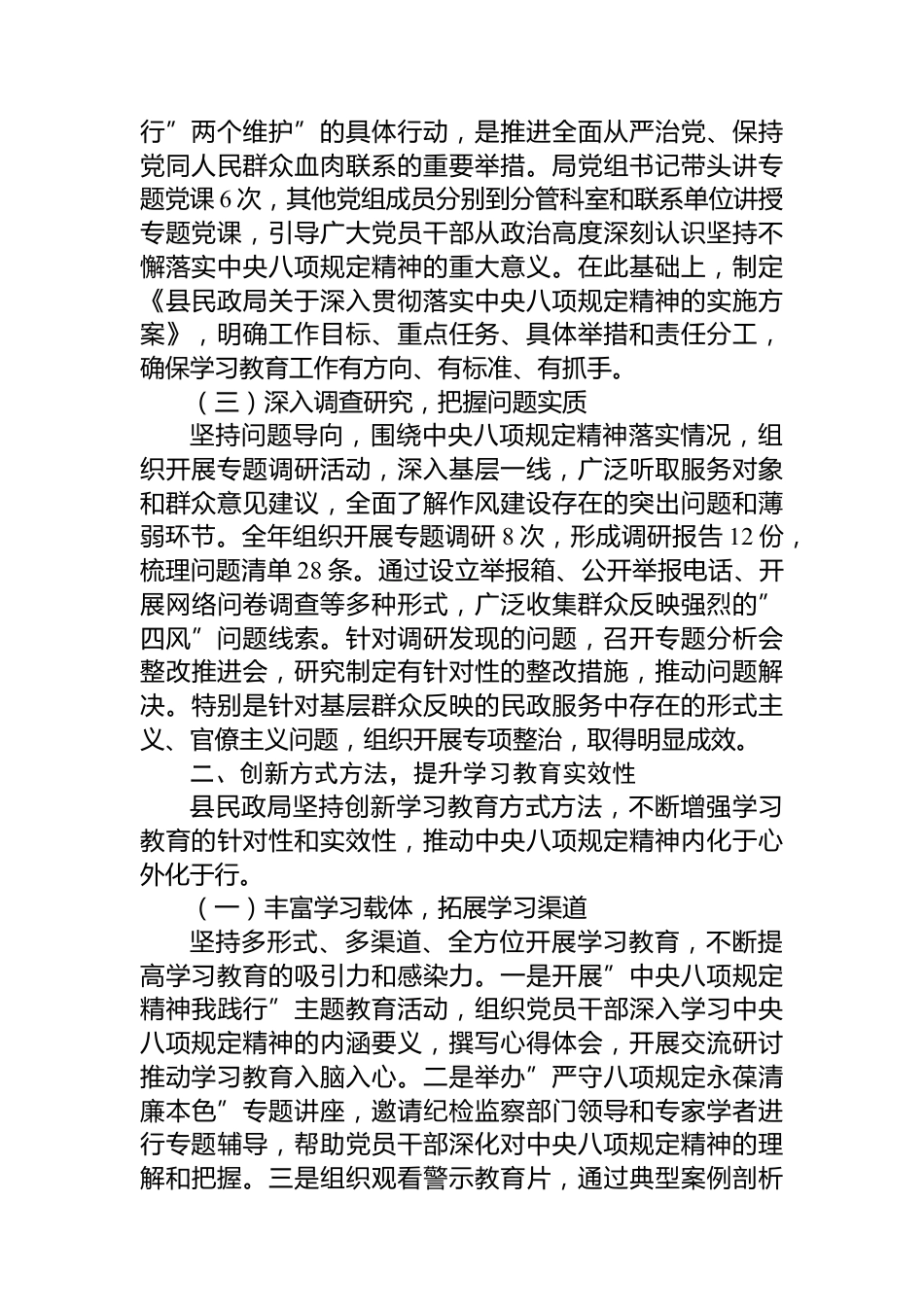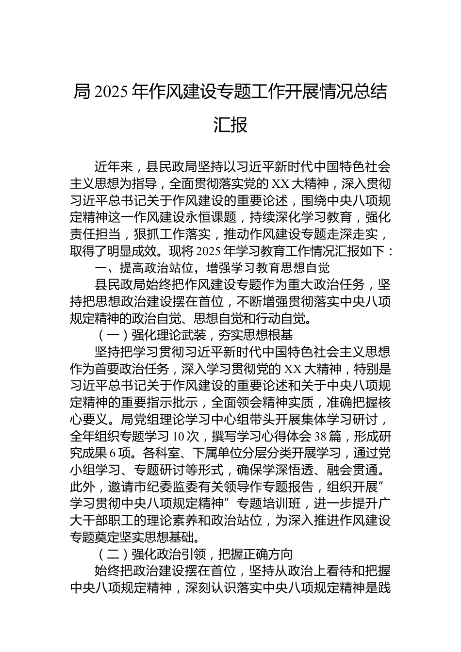 局2025年作風建設專題工作開展情況總結(jié)匯報近年來,縣民政局堅持以習近平新時代中國特色社會主義思想為指導,全面貫徹落實黨的XX大精神,深入貫徹習近平總書記關于作風建設的重要論述,圍繞中央八項規(guī)定精神這一作風建設永恒課題,持續(xù)深化學習教育,強化責任擔當,狠抓工作落實,推動作風建設專題走深走實,取得了明顯成效?,F(xiàn)將2025年學習教育工作情況匯報如下:一、提高政治站位,增強學習教育思想自覺縣民政局始終把作風建設專題作為重大政治任務,堅持把思想政治建設擺在首位,不斷增強貫徹落實中央八項規(guī)定精神的政治自覺、思想自覺和行動自覺。(一)強化理論武裝...