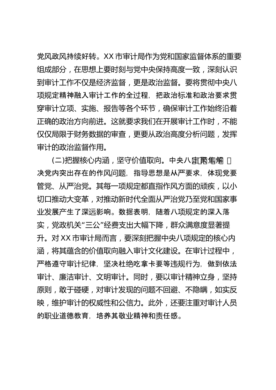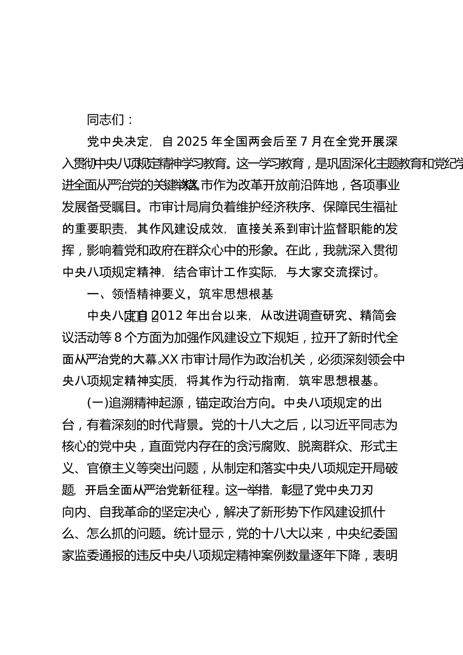 同志們:黨中央決定,自2025年全國(guó)兩會(huì)后至7月在全黨開(kāi)展深入貫徹中央八項(xiàng)規(guī)定精神學(xué)習(xí)教育。這一學(xué)習(xí)教育,是鞏固深化主題教育和黨紀(jì)學(xué)進(jìn)全面從嚴(yán)治黨的關(guān)鍵舉措。XX市作為改革開(kāi)放前沿陣地,各項(xiàng)事業(yè)發(fā)展備受矚目。市審計(jì)局肩負(fù)著維護(hù)經(jīng)濟(jì)秩序、保障民生福祉的重要,其作建成效,直接關(guān)系到督能的職責(zé)風(fēng)設(shè)審計(jì)監(jiān)職發(fā)揮,影響著黨和政府在群眾心中的形象。在此,我就深入貫徹中央八定精神,合工作,與大家交流探。項(xiàng)規(guī)結(jié)審計(jì)實(shí)際討一、領(lǐng)悟精神要義,筑牢思想根基項(xiàng)項(xiàng)項(xiàng)項(xiàng)中央八定自2012年出臺(tái)以來(lái),從改研究、精會(huì)進(jìn)調(diào)查簡(jiǎn)議活動(dòng)等8個(gè)方面為加強(qiáng)作風(fēng)建設(shè)立下規(guī)矩,拉開(kāi)...