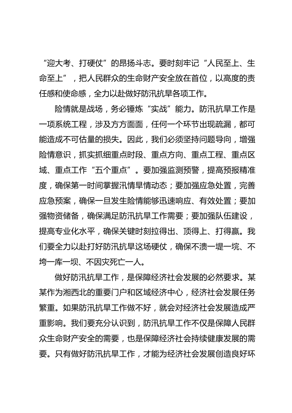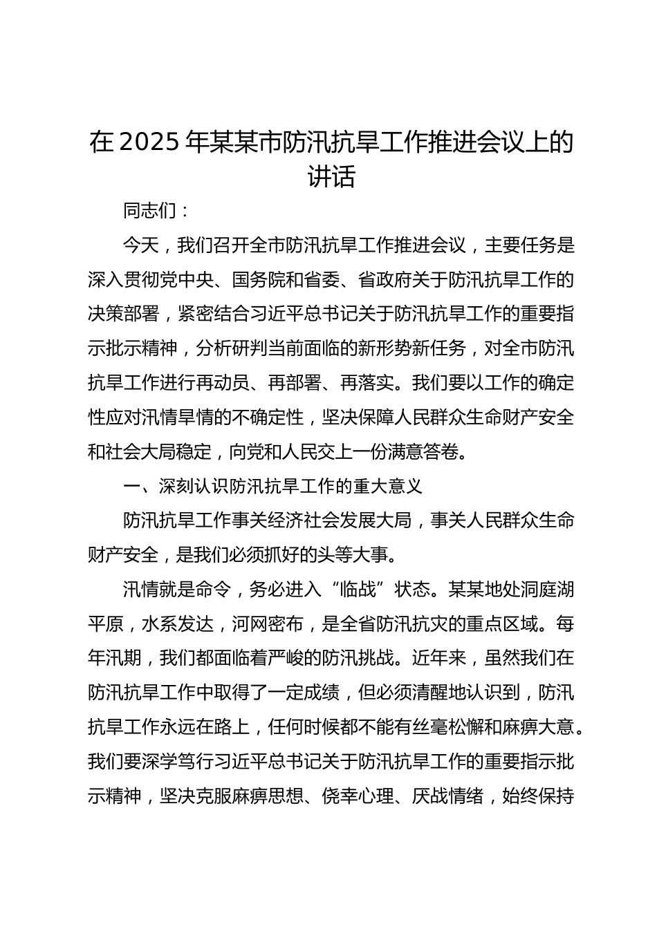 在2025年某某市防汛抗旱工作推進(jìn)會(huì)議上的講話同志們:今天,我們召開全市防汛抗旱工作推進(jìn)會(huì)議,主要任務(wù)是深入貫徹黨中央、國務(wù)院和省委、省政府關(guān)于防汛抗旱工作的決策部署,緊密結(jié)合習(xí)近平總書記關(guān)于防汛抗旱工作的重要指示批示精神,分析研判當(dāng)前面臨的新形勢(shì)新任務(wù),對(duì)全市防汛抗旱工作進(jìn)行再動(dòng)員、再部署、再落實(shí)。我們要以工作的確定性應(yīng)對(duì)汛情旱情的不確定性,堅(jiān)決保障人民群眾生命財(cái)產(chǎn)安全和社會(huì)大局穩(wěn)定,向黨和人民交上一份滿意答卷。一、深刻認(rèn)識(shí)防汛抗旱工作的重大意義防汛抗旱工作事關(guān)經(jīng)濟(jì)社會(huì)發(fā)展大局,事關(guān)人民群眾生命財(cái)產(chǎn)安全,是我們必須抓好的頭等大...