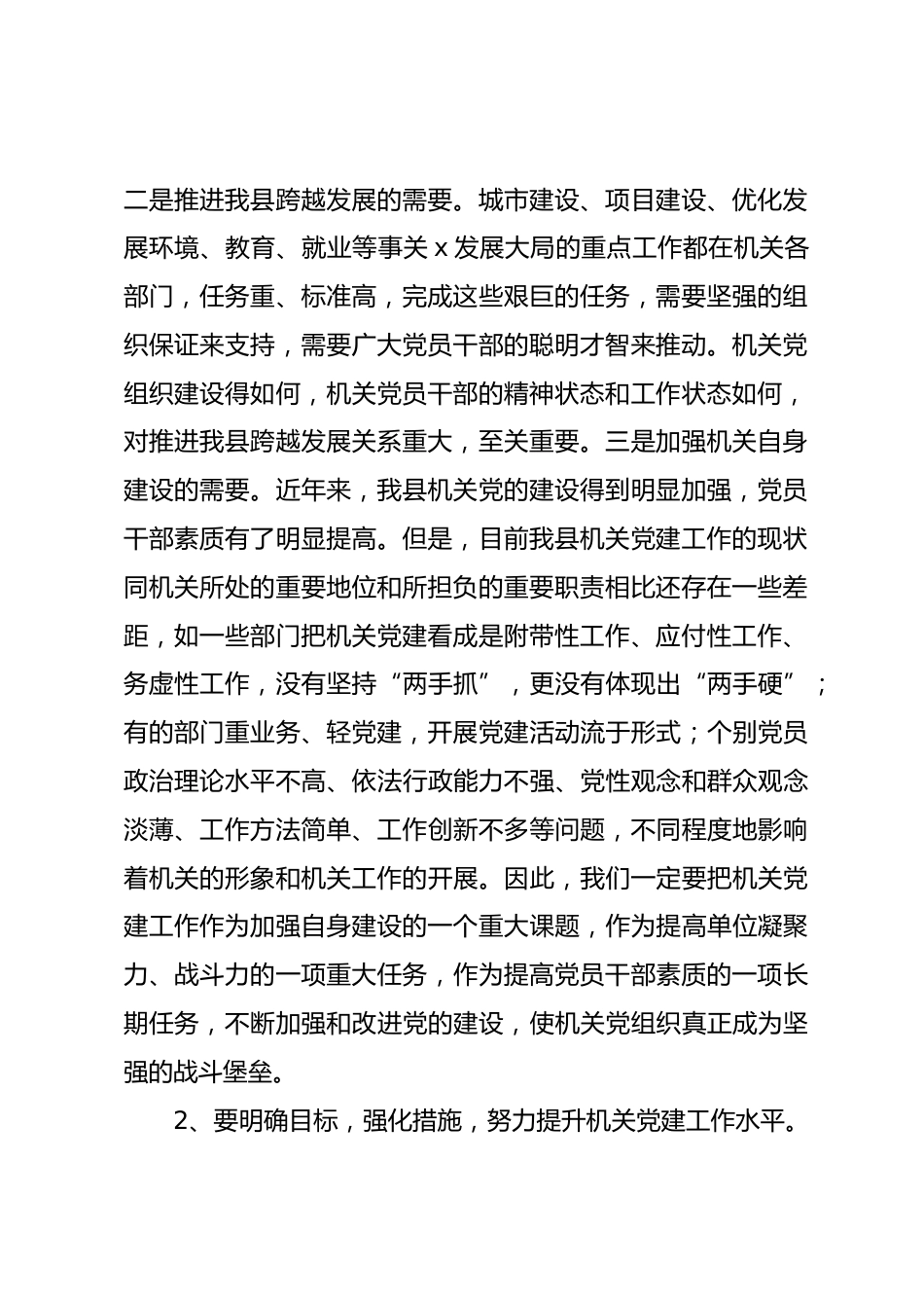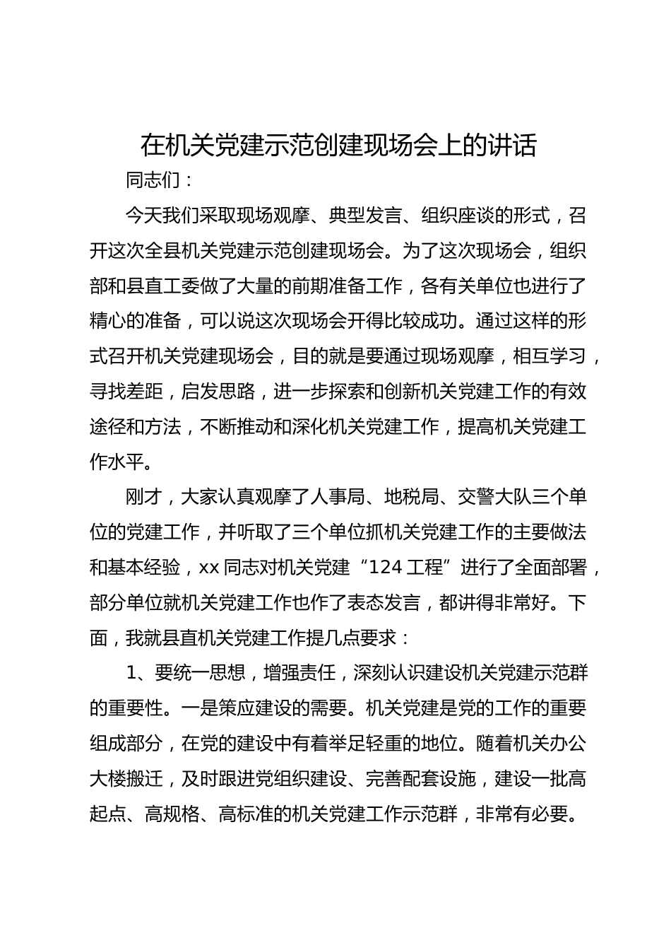 在機(jī)關(guān)黨建示范創(chuàng)建現(xiàn)場(chǎng)會(huì)上的講話同志們:今天我們采取現(xiàn)場(chǎng)觀摩、典型發(fā)言、組織座談的形式,召開這次全縣機(jī)關(guān)黨建示范創(chuàng)建現(xiàn)場(chǎng)會(huì)。為了這次現(xiàn)場(chǎng)會(huì),組織部和縣直工委做了大量的前期準(zhǔn)備工作,各有關(guān)單位也進(jìn)行了精心的準(zhǔn)備,可以說這次現(xiàn)場(chǎng)會(huì)開得比較成功。通過這樣的形式召開機(jī)關(guān)黨建現(xiàn)場(chǎng)會(huì),目的就是要通過現(xiàn)場(chǎng)觀摩,相互學(xué)習(xí),尋找差距,啟發(fā)思路,進(jìn)一步探索和創(chuàng)新機(jī)關(guān)黨建工作的有效途徑和方法,不斷推動(dòng)和深化機(jī)關(guān)黨建工作,提高機(jī)關(guān)黨建工作水平。剛才,大家認(rèn)真觀摩了人事局、地稅局、交警大隊(duì)三個(gè)單位的黨建工作,并聽取了三個(gè)單位抓機(jī)關(guān)黨建工作的主要做法和...