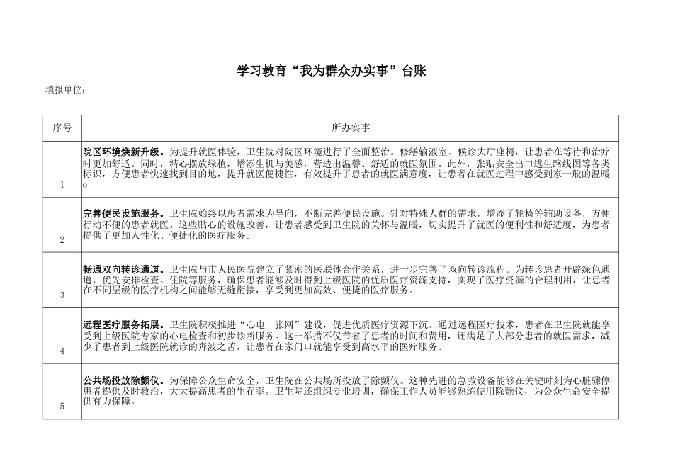 學(xué)習(xí)教育“我為群眾辦實(shí)事”臺(tái)賬填報(bào)單位:序號(hào)所辦實(shí)事1院區(qū)環(huán)境煥新升級(jí)。為提升就醫(yī)體驗(yàn),衛(wèi)生院對(duì)院區(qū)環(huán)境進(jìn)行了全面整治。修繕輸液室、候診大廳座椅,讓患者在等待和治療時(shí)更加舒適。同時(shí),精心擺放綠植,增添生機(jī)與美感,營(yíng)造出溫馨、舒適的就醫(yī)氛圍。此外,張貼安全出口逃生路線圖等各類標(biāo)識(shí),方便患者快速找到目的地,提升就醫(yī)便捷性,有效提升了患者的就醫(yī)滿意度,讓患者在就醫(yī)過(guò)程中感受到家一般的溫暖o2完善便民設(shè)施服務(wù)。衛(wèi)生院始終以患者需求為導(dǎo)向,不斷完善便民設(shè)施。針對(duì)特殊人群的需求,增添了輪椅等輔助設(shè)備,方便行動(dòng)不便的患者就醫(yī)。這些貼心的設(shè)施...