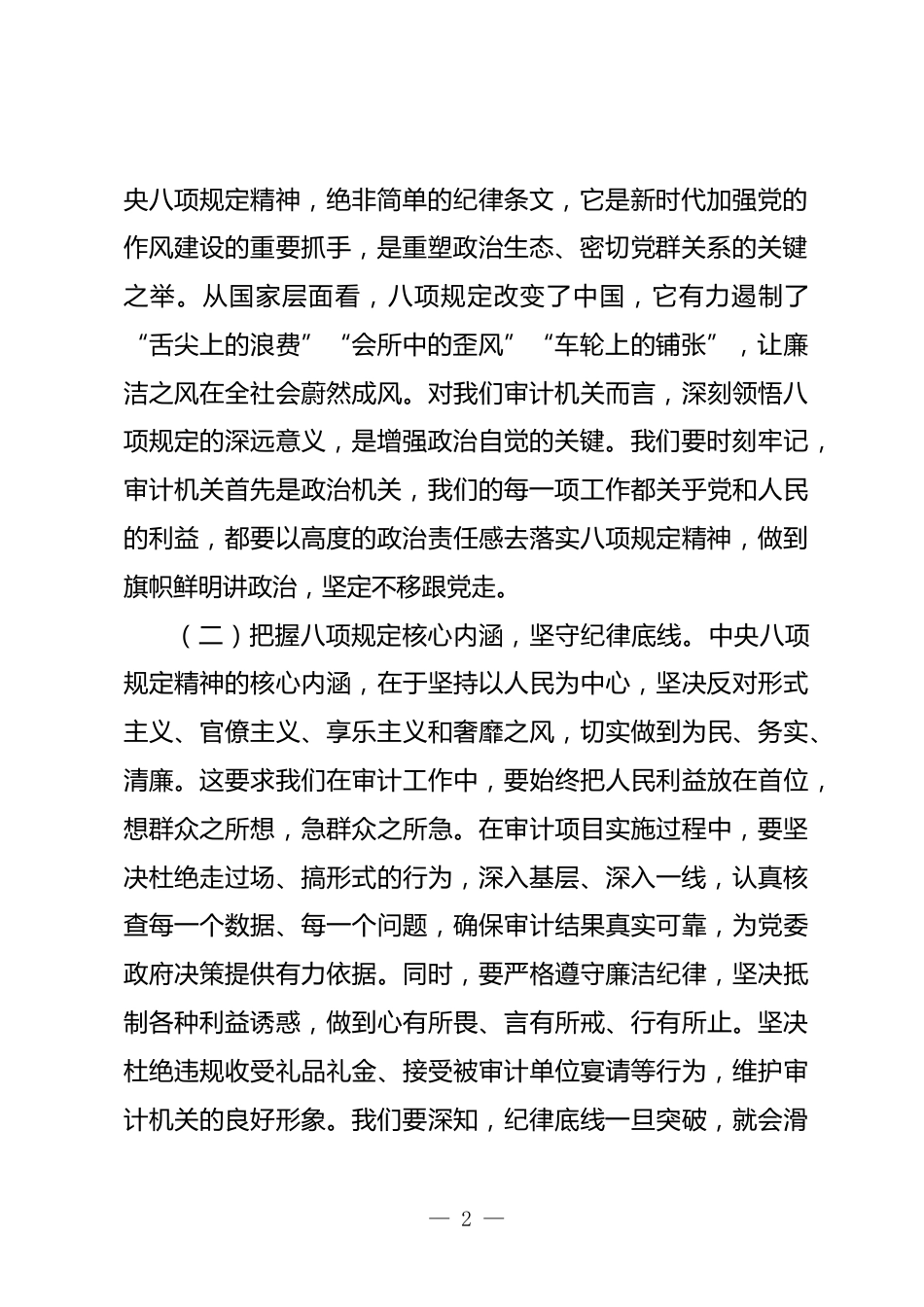 在審計(jì)局違反中央八項(xiàng)規(guī)定精神警示教育會(huì)上的講話同志們:近期,我們身邊發(fā)生的審計(jì)干部違規(guī)吃喝、違規(guī)收受禮品酒駕醉駕等典型案例,如警鐘般在耳邊長鳴,為我們敲響了作風(fēng)建設(shè)的緊迫之鐘。這些案例,不僅損害了審計(jì)隊(duì)伍的形象,更侵蝕了審計(jì)事業(yè)發(fā)展的根基。今天,我們召開違反中央八項(xiàng)規(guī)定精神警示教育會(huì),就是要痛定思痛,深刻反思,通過以案說紀(jì)、以案說法、以案說責(zé),讓每一位同志都能受警醒、明底線、知敬畏。同時(shí)也是對(duì)局機(jī)關(guān)開展深入貫徹中央八項(xiàng)規(guī)定精神學(xué)習(xí)教育的再動(dòng)員、再部署,以最堅(jiān)決的態(tài)度、最有力的舉措,將作風(fēng)建設(shè)推向深入,為XX審計(jì)事業(yè)高質(zhì)量發(fā)展提...