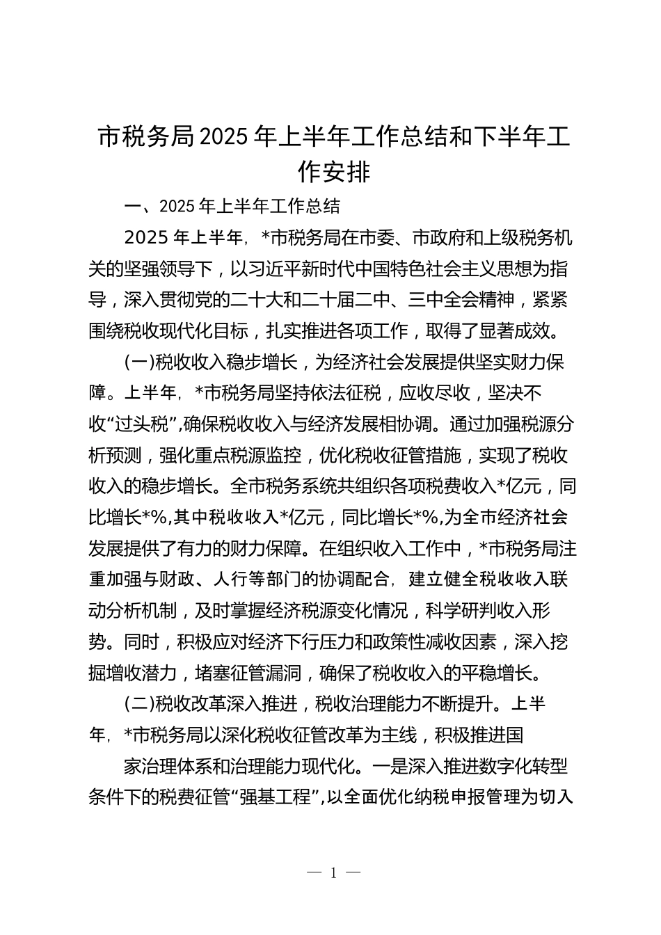 市稅務(wù)局2025年上半年工作總結(jié)和下半年工作安排一、2025年上半年工作總結(jié)2025年上半年,*市稅務(wù)局在市委、市政府和上級稅務(wù)機(jī)關(guān)的堅強(qiáng)領(lǐng)導(dǎo)下,以習(xí)近平新時代中國特色社會主義思想為指導(dǎo),深入貫徹黨的二十大和二十屆二中、三中全會精神,緊緊圍繞稅收現(xiàn)代化目標(biāo),扎實推進(jìn)各項工作,取得了顯著成效。(一)稅收收入穩(wěn)步增長,為經(jīng)濟(jì)社會發(fā)展提供堅實財力保障。上半年,*市稅務(wù)局堅持依法征稅,應(yīng)收盡收,堅決不“”收過頭稅,確保稅收收入與經(jīng)濟(jì)發(fā)展相協(xié)調(diào)。通過加強(qiáng)稅源分析預(yù)測,強(qiáng)化重點稅源監(jiān)控,優(yōu)化稅收征管措施,實現(xiàn)了稅收收入的穩(wěn)步增長。全市稅務(wù)系統(tǒng)共組織各項...