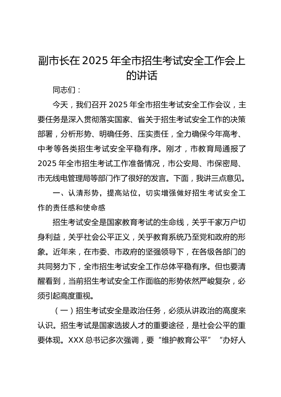 副市長在2025年全市招生考試安全工作會上的講話VIP免費