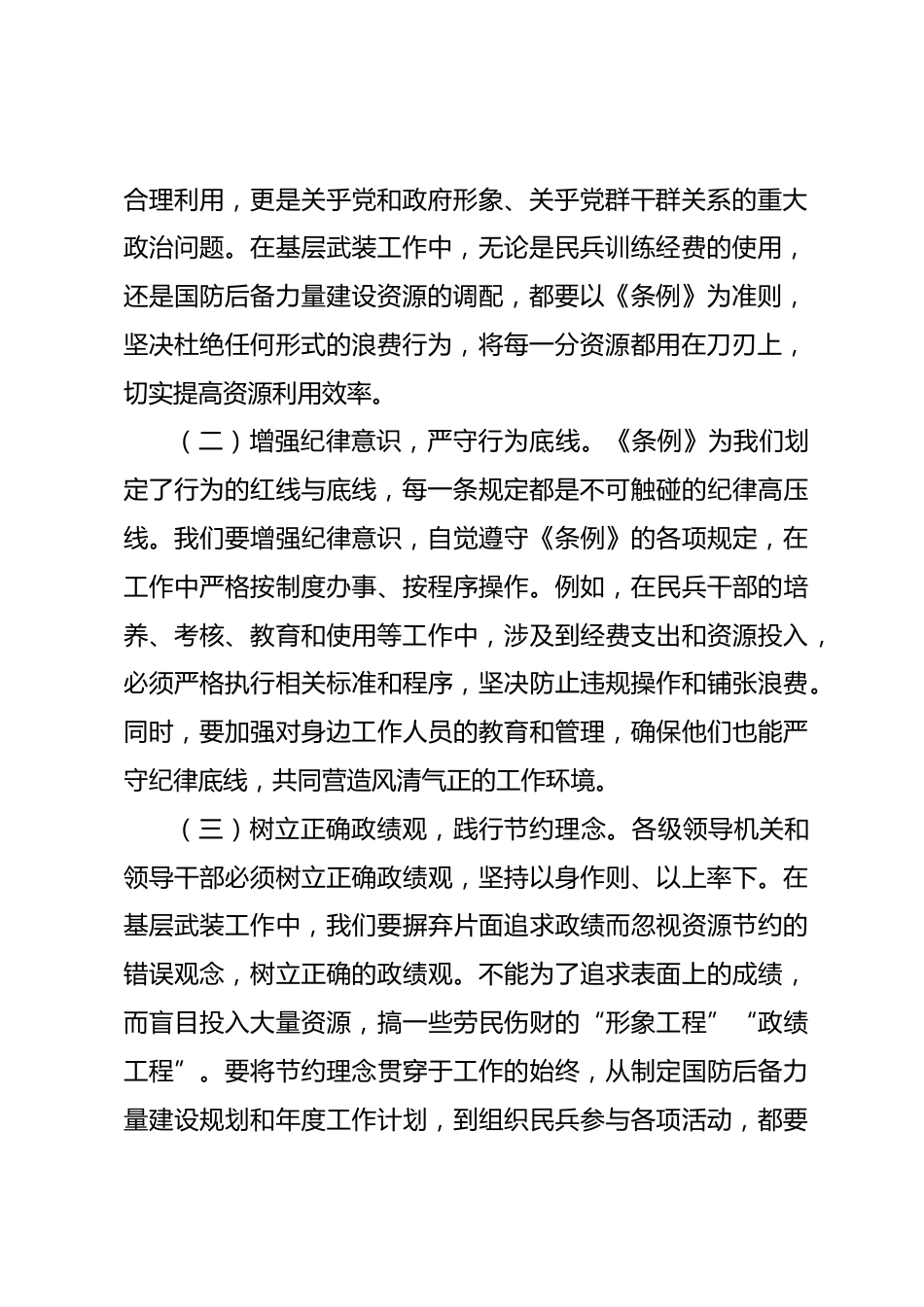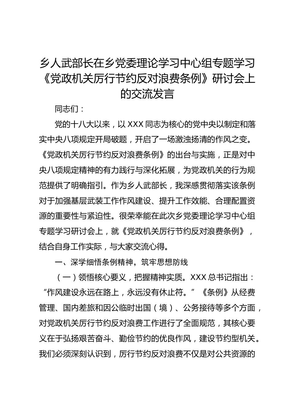 鄉(xiāng)人武部長在鄉(xiāng)黨委理論學(xué)習(xí)中心組專題學(xué)習(xí)《黨政機(jī)關(guān)厲行節(jié)約反對(duì)浪費(fèi)條例》研討會(huì)上的交流發(fā)言同志們:黨的十八大以來,以XXX同志為核心的黨中央以制定和落實(shí)中央八項(xiàng)規(guī)定開局破題,開啟了一場激濁揚(yáng)清的作風(fēng)之變。《黨政機(jī)關(guān)厲行節(jié)約反對(duì)浪費(fèi)條例》的出臺(tái)與實(shí)施,正是對(duì)中央八項(xiàng)規(guī)定精神的有力踐行與深化拓展,為黨政機(jī)關(guān)的行為規(guī)范提供了明確指引。作為鄉(xiāng)人武部長,我深感貫徹落實(shí)該條例對(duì)于加強(qiáng)基層武裝工作作風(fēng)建設(shè)、提升工作效能、合理配置資源的重要性與緊迫性。很榮幸能在此次鄉(xiāng)黨委理論學(xué)習(xí)中心組專題學(xué)習(xí)研討會(huì)上,就《黨政機(jī)關(guān)厲行節(jié)約反對(duì)浪費(fèi)條例》,結(jié)合...